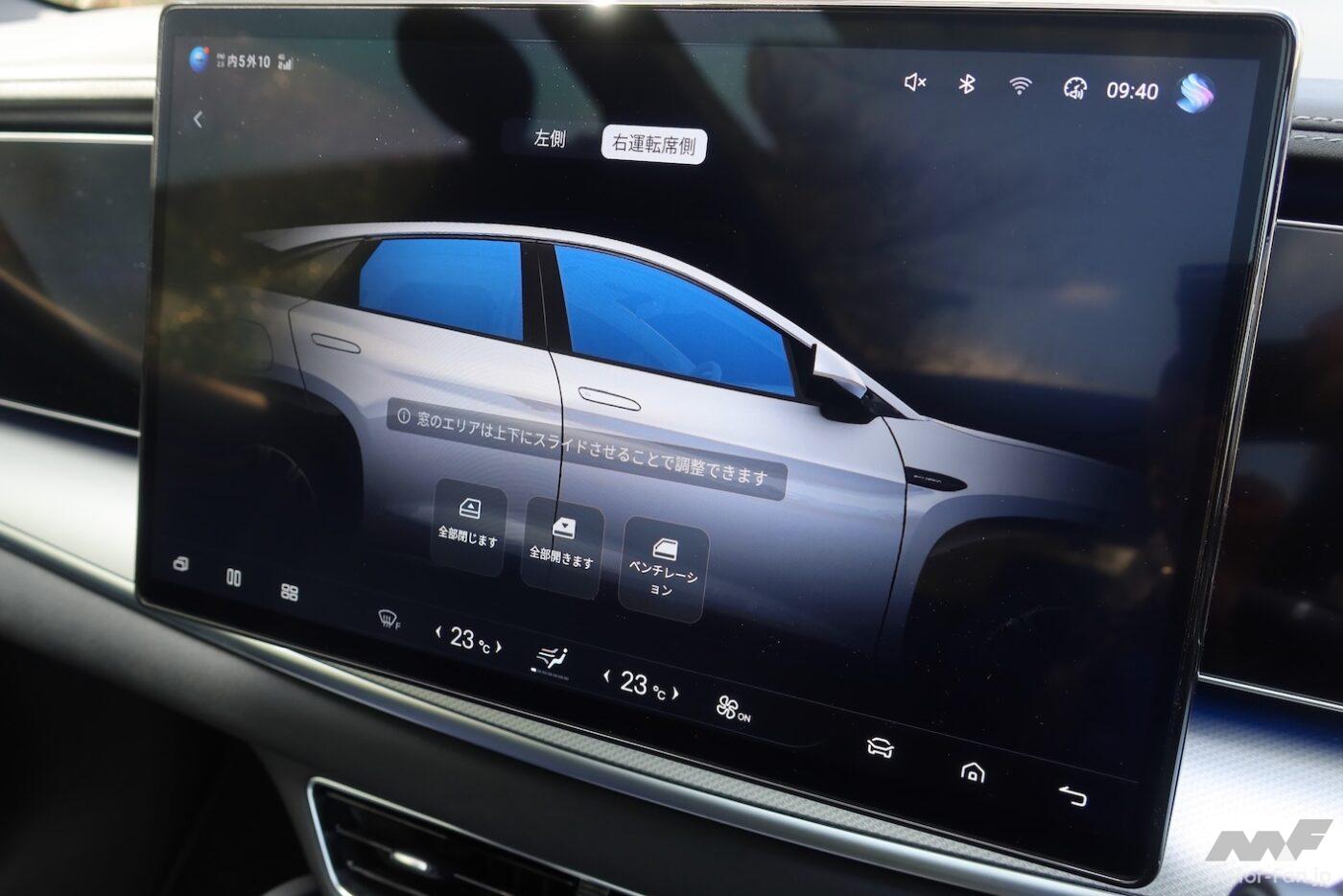 シーライオン7の特徴は、高い処理能力を生かしたインフォテインメント系の機能であると感じた。それが本当に必要か、便利かは別にして、驚かされることしきりだ。まず、タッチディスプレイに表示されるグラフィックが高精彩できれい。クルマの外観をメニューから呼び出し、タッチして向きを変え、ルーフをワイプすると指を動かしたぶんだけパノラミックルーフの電動サンシェードが開いたり、閉じたりする。サイドウインドウも同様だ。