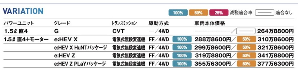 24年SUV上半期販売台数ナンバー1と現在も人気絶大。24年4月のマイナーチェンジでは内外装をリフレッシュするとともに、走行性能や静粛性に関わる部分も大幅にアップデート。ハイブリッドの「e:HEV X」にクロスオーバーテイスト「HuNTパッケージ」、上級仕様の「e:HEV Z」に「PLaYパッケージ」を新設定。それと同時にガソリン車「G」の駆動方式は4WDのみに整理されている。