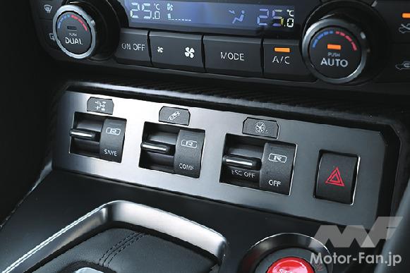 新車外騒音規制対応の新構造マフラーの採用により、MY23以前に比べて音量は控えめになったものの、それでもアクセルを踏み込むと加速に合わせてサウンドが巧みに変化して、いかにも高性能車をドライブしているという高揚感をこれまでどおり味わわせてくれる。「プレミアムエディションTスペック」には、専用のカーボンセラミックブレーキやアルミ鍛造ホイールが標準装備され、サスペンションチューニングも専用となる。フロントホイールが標準モデルよりも太い10Jとなるため、拡幅とともにアウトレットダクトを備えた専用のフロントフェンダーが装着されている。