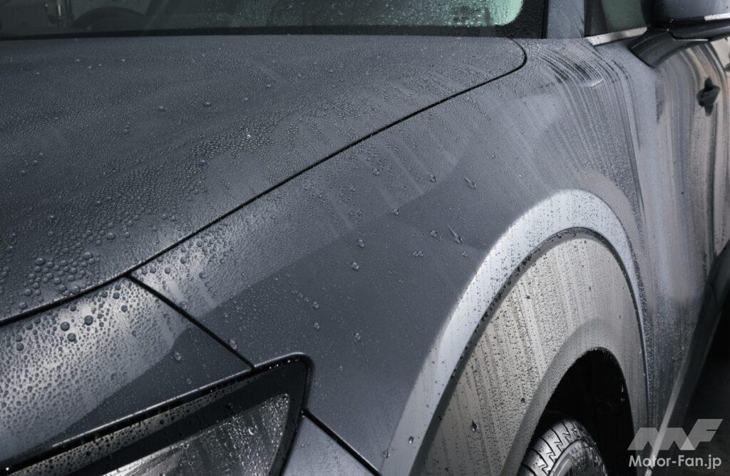 高性能の要となるのはオイル系レジンを独自処方していること。特許出願済みとなるこの高濃度レジンにより、ボディと黒樹脂パーツのツヤを深め、雨水を寄せ付けない撥水力を実現した。