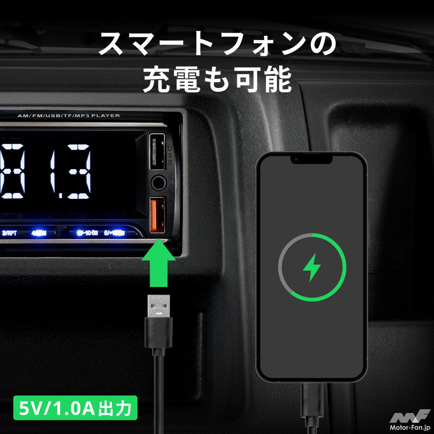 ディスプレイは大型で受信周波数やトラック番号、再生時間などをわかりやすく表示。時計表示にも対応している。音楽メディア再生用USBポートのほかに充電用USBポートも備え、スマホの充電などで活用できる。