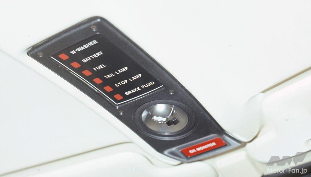 バッテリー、ガソリン、ブレーキリザーブの各液量、ストップ&テールランプ断線などの異常を察知すると、オーバーヘッドコンソール上の赤ランプ点灯でドライバーに知らせる。