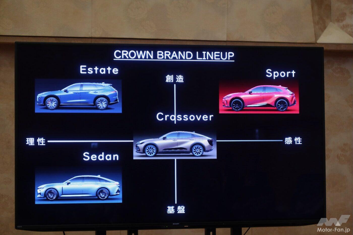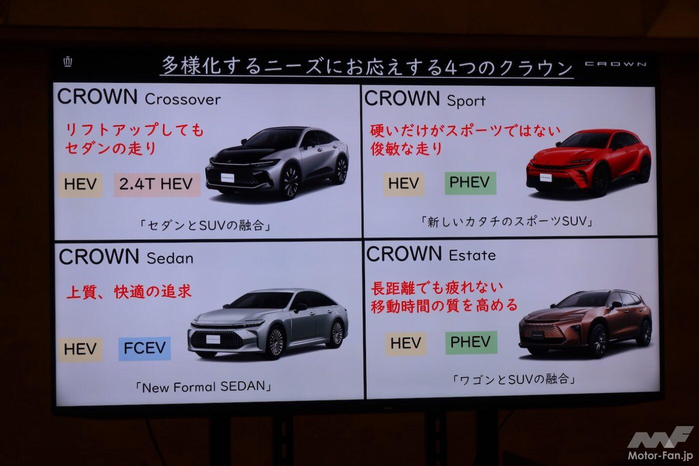 つまり、「クラウンに乗りたい」「そろそろクラウン」と思ってディーラーに行けば、これだけのバリエーションのなかから好みのクラウンを選べるということだ。これが「群」で戦うクラウンということなのだろう。実際、クラウンオーナーの平均年齢は劇的に若返り、ディーラーで実物を見て試乗した結果、当初の目論見と違う車型を選ぶ人も続出しているという。