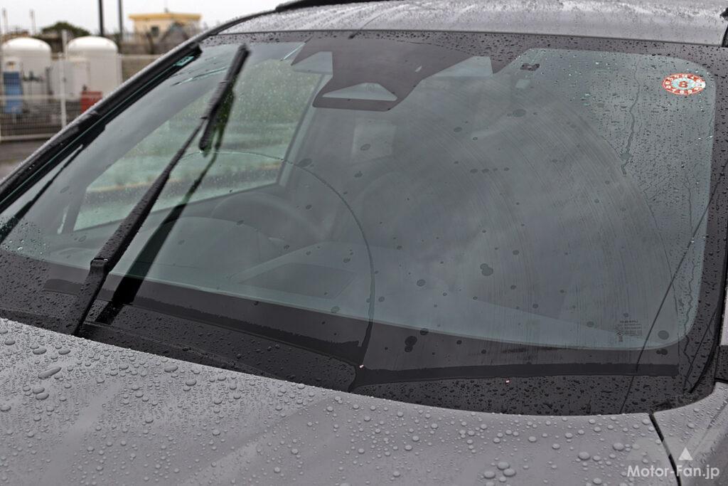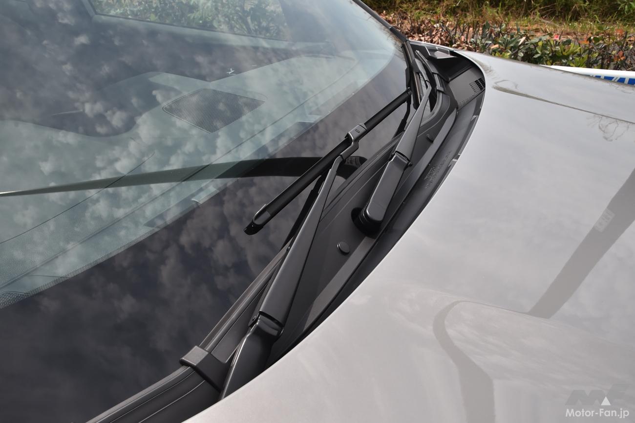 試乗車をお借りした2日目にはあいにくの雨天だったが、ルーフやフロントガラスに当たる雨音も、心なしか静かになったことを感じさせる。フロントワイパーには先代モデルから採用されているフラットワイパーが装備されており、視界をクリアに払拭してくれるだけでなく、従来のトーナメント式と比較するとビビり音などもなく、構造もシンプルでありながら、空力性能も向上している点が特徴だ。