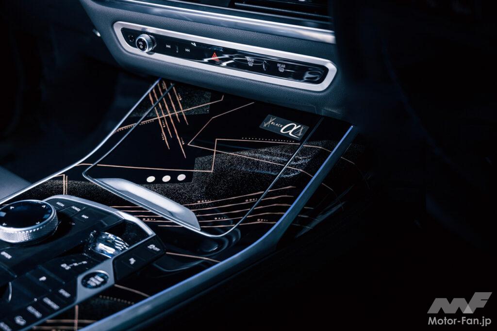 「X7 M60i xDriveブラックアルファ」には、ほかにも専用装備品が付加されている。センターコンソールには、漆芸作家である服部一齋氏作の漆蒔絵/螺鈿装飾トリムを採用。縁起の良いタイミングで吹く追い風「時つ風」をコンセプトに、深淵のなかで時つ風が吹くことで光り輝く一筋の光を銀で表現し、白蝶貝の輝きをアクセントに、繊細に塗られた漆と銀によって上質かつしっとりとした蒔絵らしい光を纏い、また、直線的で力強いデザインにより、BMWの「駆けぬける歓び」をイメージしている。