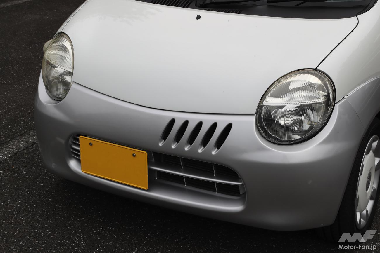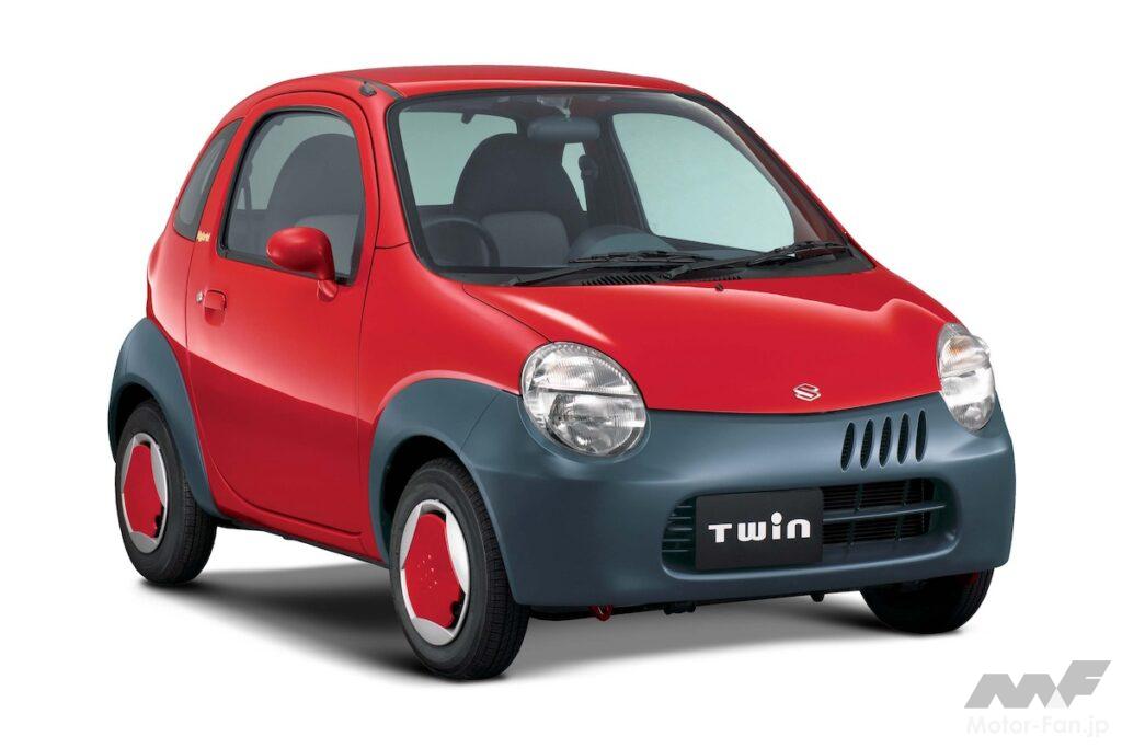 もう1台の国産シティコミューターのスズキ「ツイン」は、1999年の第33回東京モーターショーに「Pu3コミュータ」として発表。当時のアルト(HA12)をベースとした2シーターコミューターで、ホイールベースをアルトの2360mmから1800mmへ560mmも短縮。リヤハッチを廃した2ドアとすることで、コストの削減だけでなく、少ないパーツでモノコックボディの強度を増している。