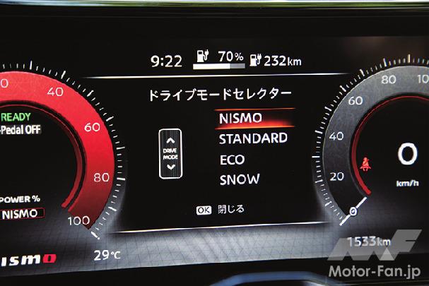 ちなみに最大トルク600Nmは同じだが、より高速域までトルク感をキープできるようになり、より高速走行の伸びを実現したというのも、NISMOらしいセッティングだと頷けるポイント。さらにドライブモードでNISMOモードを選択すると、発進や中間加速など、ココぞ!というときに瞬時にレスポンス良くパワーを得られるので、爽快なドライビングを楽しめる。
