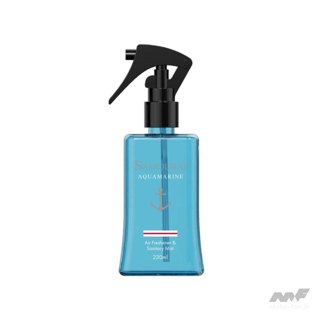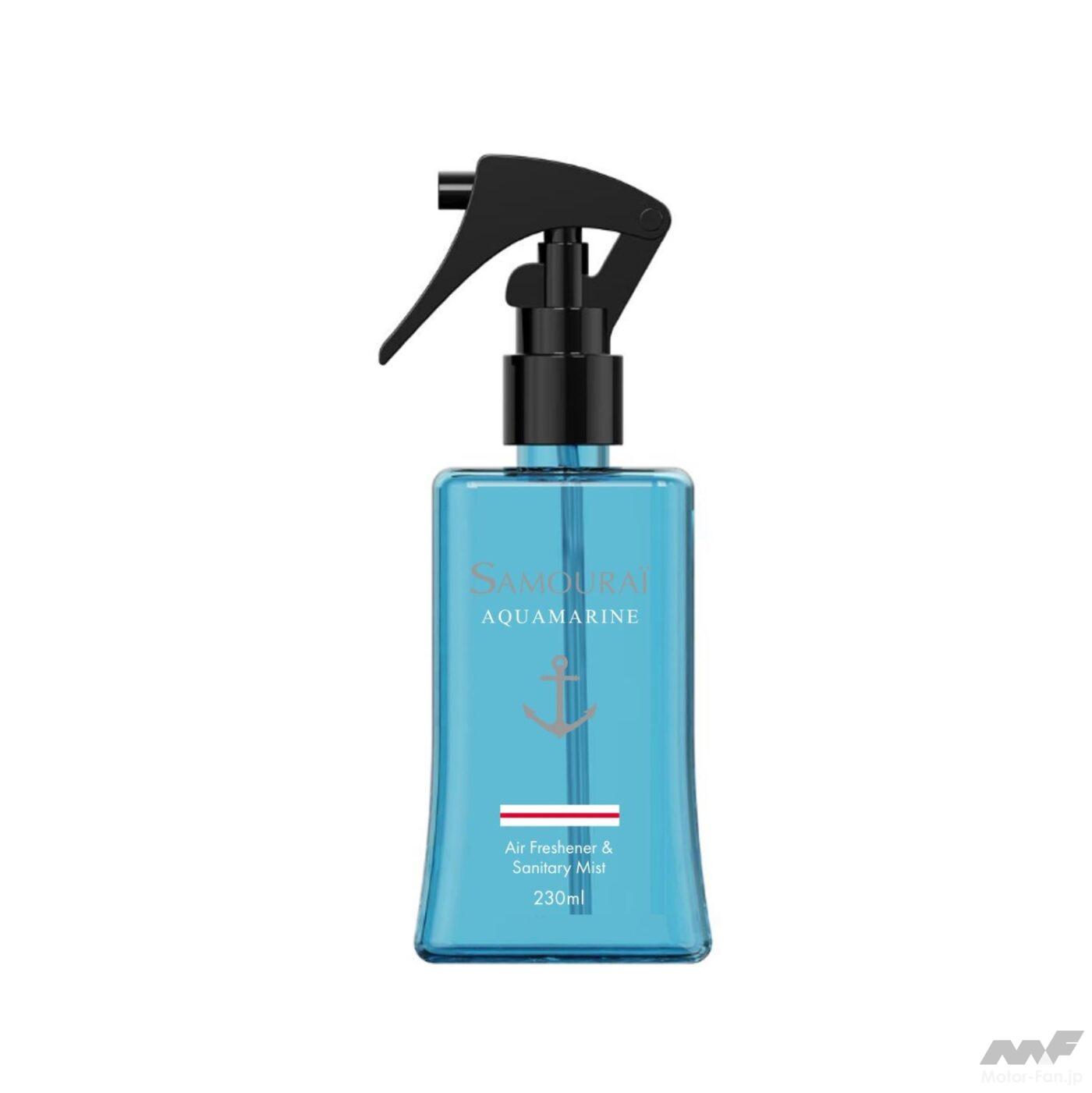 ファブリック用に調合されたミストは、生地の奥に染み付いたニオイの原因を取り除きつつ、サムライブランドならではの上質な香りをプラス。ラインアップは、男性用フレグランスに使われるフレッシュで甘く爽やかなアクアマリンと、女性用として用意されるサムライウーマンのブラックライトクロスという2種。