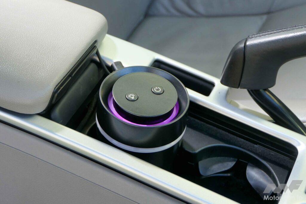 その特徴は、ボトル内部にファンを忍ばせることで、強制的に車内全域に香りを届けるということ。また、ボトル上面には8色から選択できるイルミネーションを搭載。香りを楽しみながら車内のアクセントとしても活用できるデザインは、ドリンクホルダーに収めていてもしっかりと存在感を発揮してくれる。