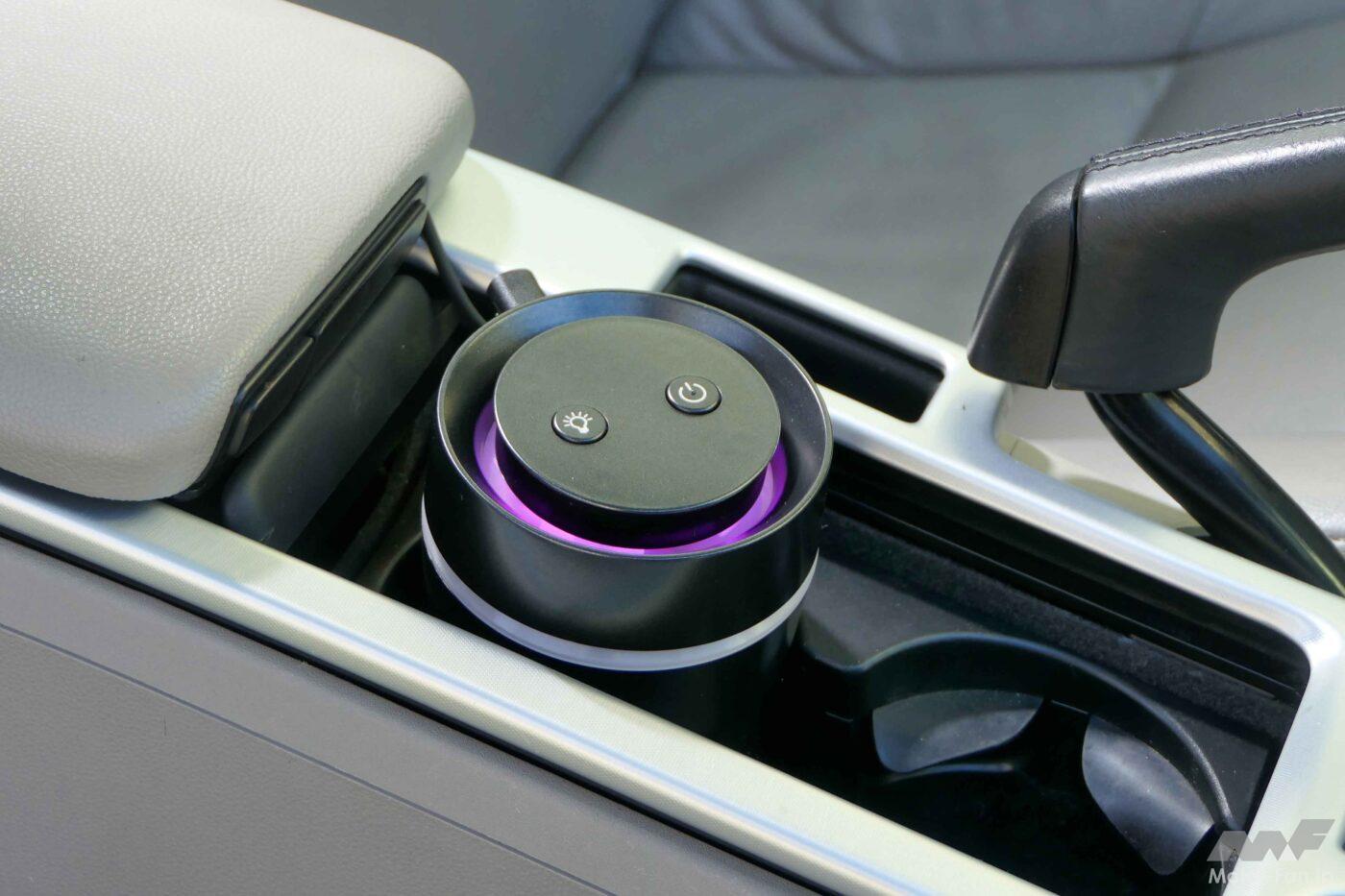 その特徴は、ボトル内部にファンを忍ばせることで、強制的に車内全域に香りを届けるということ。また、ボトル上面には8色から選択できるイルミネーションを搭載。香りを楽しみながら車内のアクセントとしても活用できるデザインは、ドリンクホルダーに収めていてもしっかりと存在感を発揮してくれる。