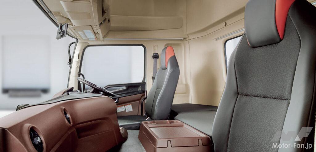 内装に目を向けると、ドライバーの作業環境の快適性が格段に向上している点が特徴です。インパネは視認性に優れたレイアウトで、液晶メーターと情報ディスプレイが統合されており、必要な情報を一目で把握できる構造となっています。シートは長距離運転に耐えうる設計で、サスペンション機構や多彩な調整機能により体への負担を軽減します。また、運転席と寝台部の空間配置が見直され、休憩時の快適性も追求されています。