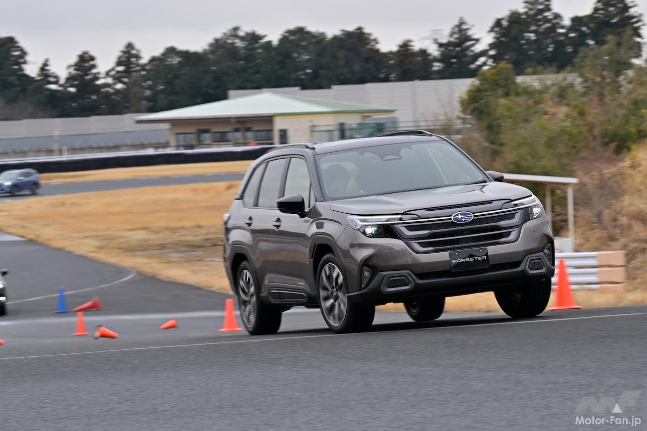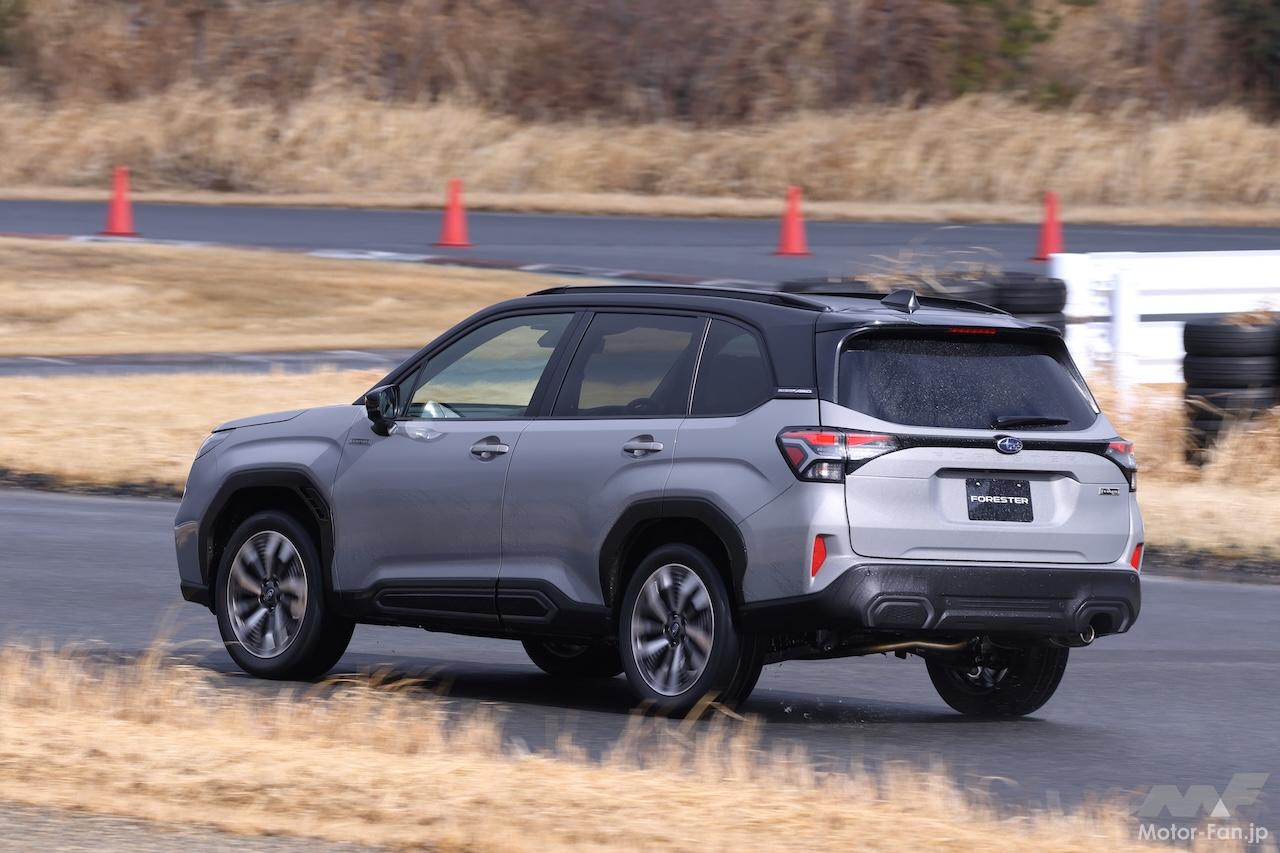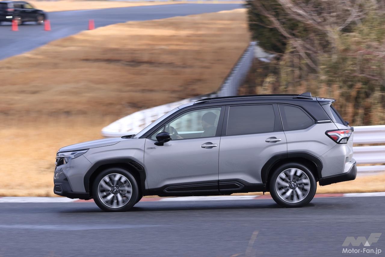 新型フォレスターのストロングハイブリッドは、クロストレックS:HEVよりも90kg重いものの、試乗ステージとなったミニサーキットの袖ケ浦フォレストレースウェイで走らせる限り、当然ながら体感上大きな差はない。当初からこうした重量差を見越した開発がされているという。