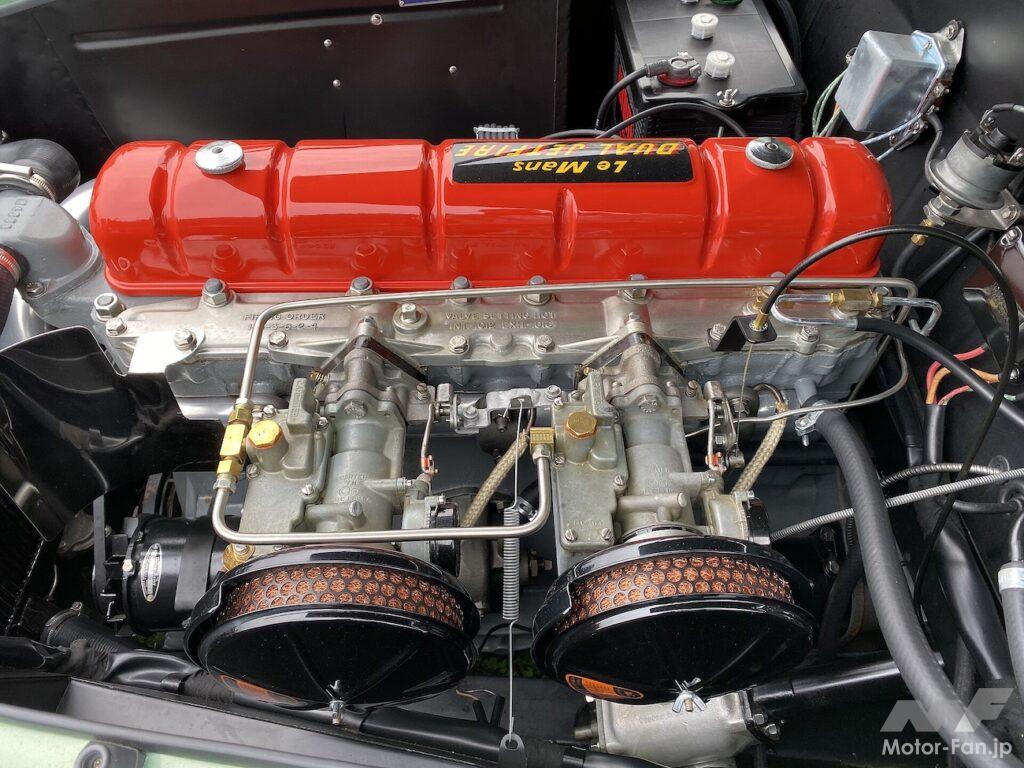そこで彼はエンジン本体の軽量化と高出力化を狙って、8:1へと高圧縮化を図ったアルミ製シリンダーヘッドを採用し、さらにノーマルのカムシャフトを改造してカムプロフィールを変えることで高回転までスムーズに回るように改造した。さらに、標準のシングルキャブレターを45φのSUキャブレター2基に換装し、新設計のインテークマニホールドに取り替えたことで吸排気効率が向上。実用車のエンジンがスポーツカーにふさわしい高性能ユニットへと変貌を遂げたのだ。その結果、ヒーレー・シルバーストーンから20%パワーアップし、最高出力は112hpから125hpへと向上。トルクは27.9kgmに達した。