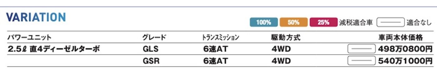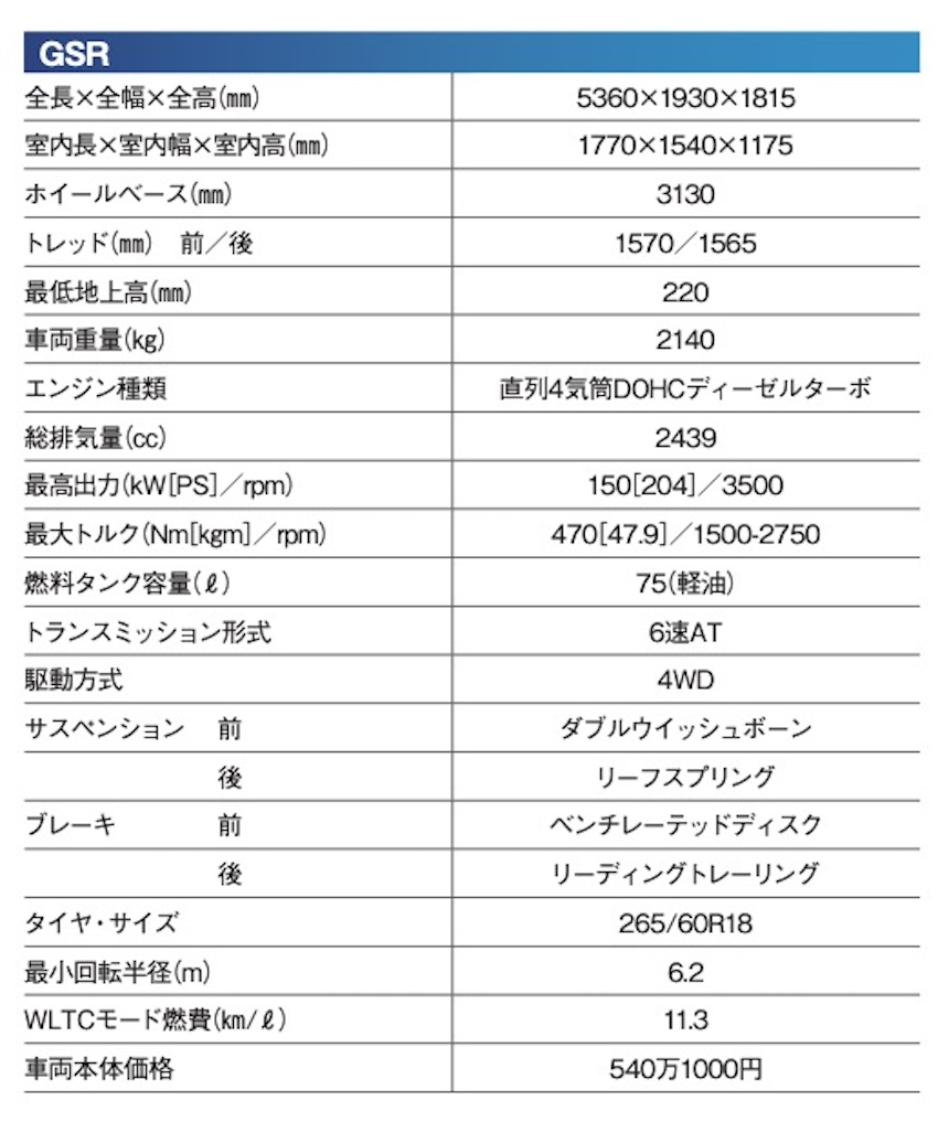 エンジンは2.42ℓのディーゼルターボを搭載。2t越えのボディには排気量が小さく思えるが、小ターボと大ターボをリレーして使用するシーケンシャルツインターボを採用しており、発進から最高速まで淀みのない加速性能を発揮する。トランスミッションは6速ATだが、神髄はその下流にある〝スーパーセレクト4WDⅡ〞。