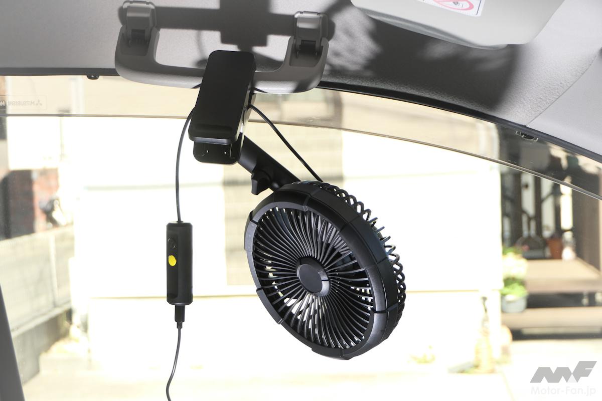 車内での固定では、アシストグリップなどに挟むことができる大型クリップの採用により、簡単に取り付け・取り外しができる。大型タイプのため、軽自動車やコンパクトカーでは運転中は少々邪魔になってしまうが、車内泊や休憩中、そしてクールダウンするときにのみ装着すれば問題ないだろう。
