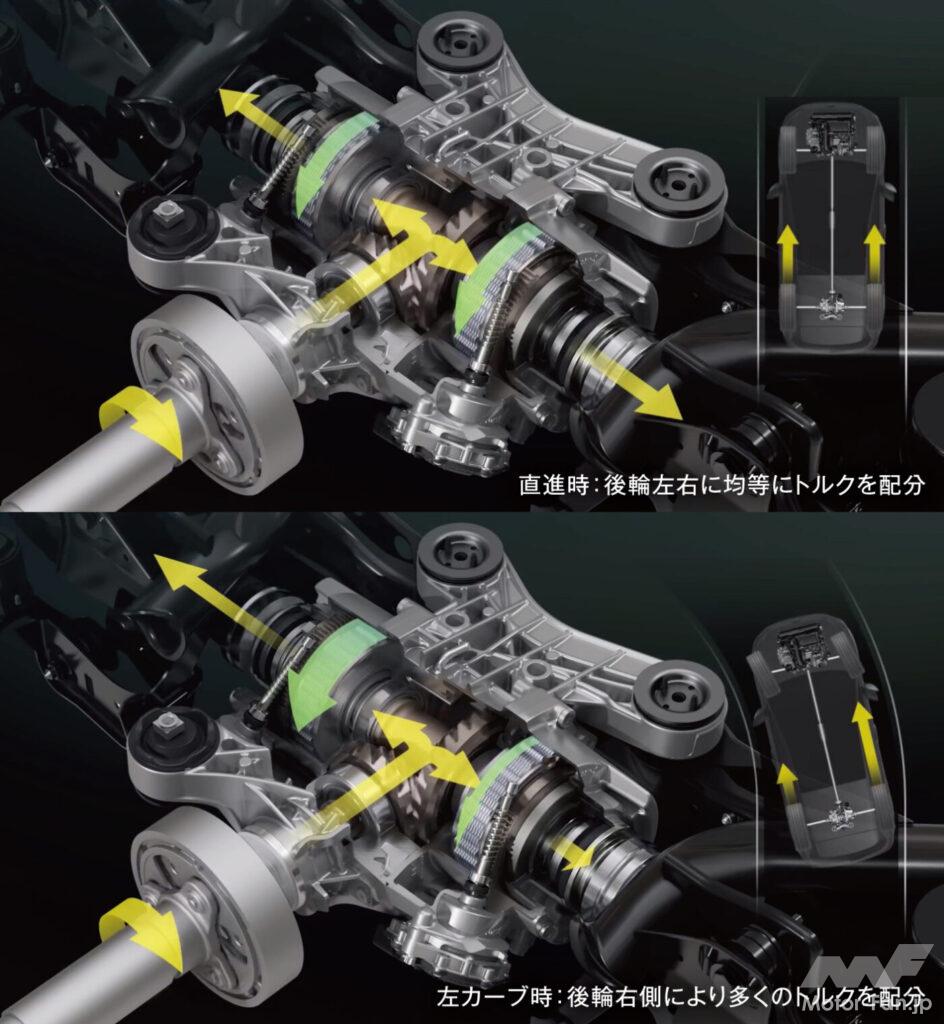 具体的には後輪左右のトルクベクタリングが行える電子制御デファレンシャルであり、左右それぞれに多板クラッチを用いた設計を新採用することで0~100%までのトルク移動が可能になっている(従来型はクラッチが一組で50:50のトルク移動だった)。