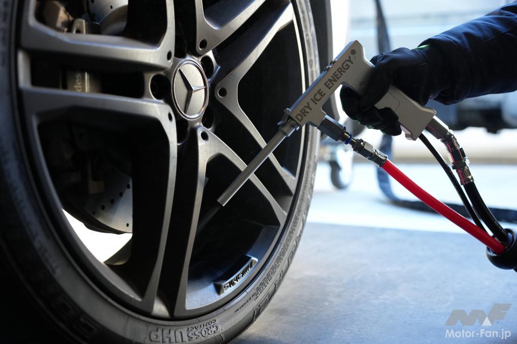 ドライアイス(3mmペレット)を圧縮エアで噴射することで、洗浄対象物を傷つけることなく、ブレーキダスト、グリース、油汚れ、泥、車内の付着物などを短時間で効果的に除去する。また、水や薬品を一切使用しないため、作業場所を選ばず、二次汚染も発生しない。