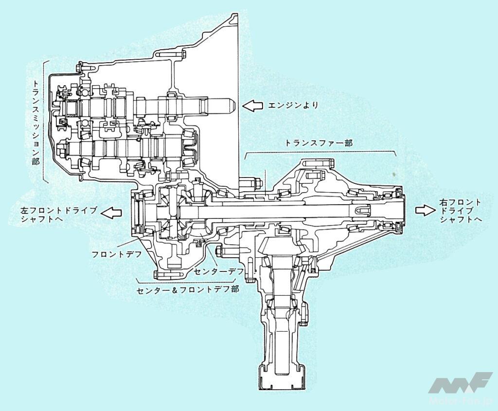 この頃の4WDではよくある話で、MT車用とAT車用とでは構造が異なり、MT車用はセンターデフに内蔵されたビスカスカップリングによるフルタイム式。