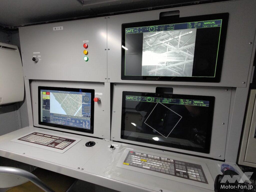 防衛装備庁の展示でひときわ目を引いたのが、「車両搭載高出力レーザ実証装置」の展示だ。この車両は小型ドローンなどを迎撃する目的で開発されたもので、重装輪回収車をベースに、10kw級のレーザー砲を搭載したもの。車両そのものは昨年11月に公開されているが、今回は内部のコントロール・ルームが来場者に開放された。