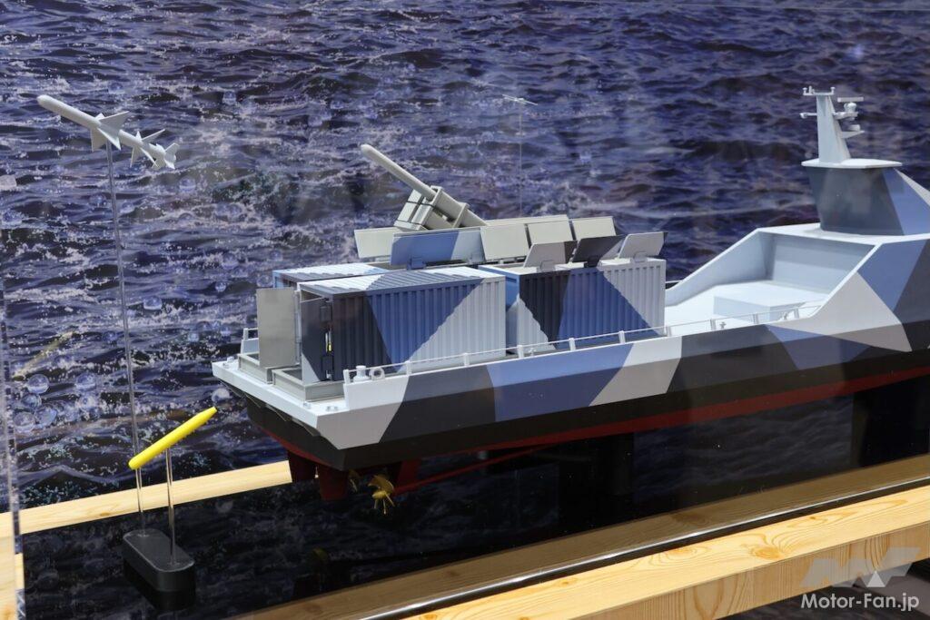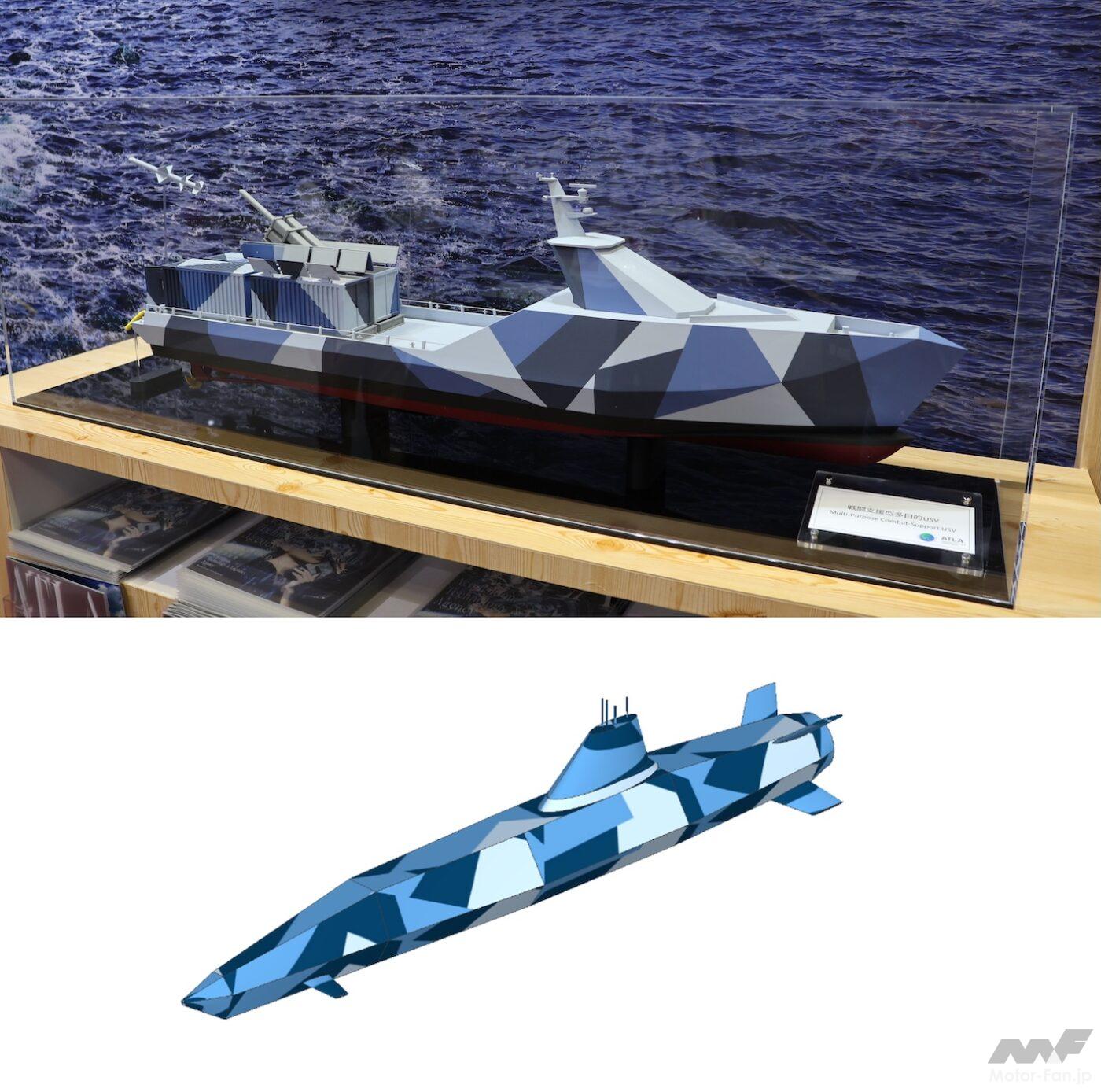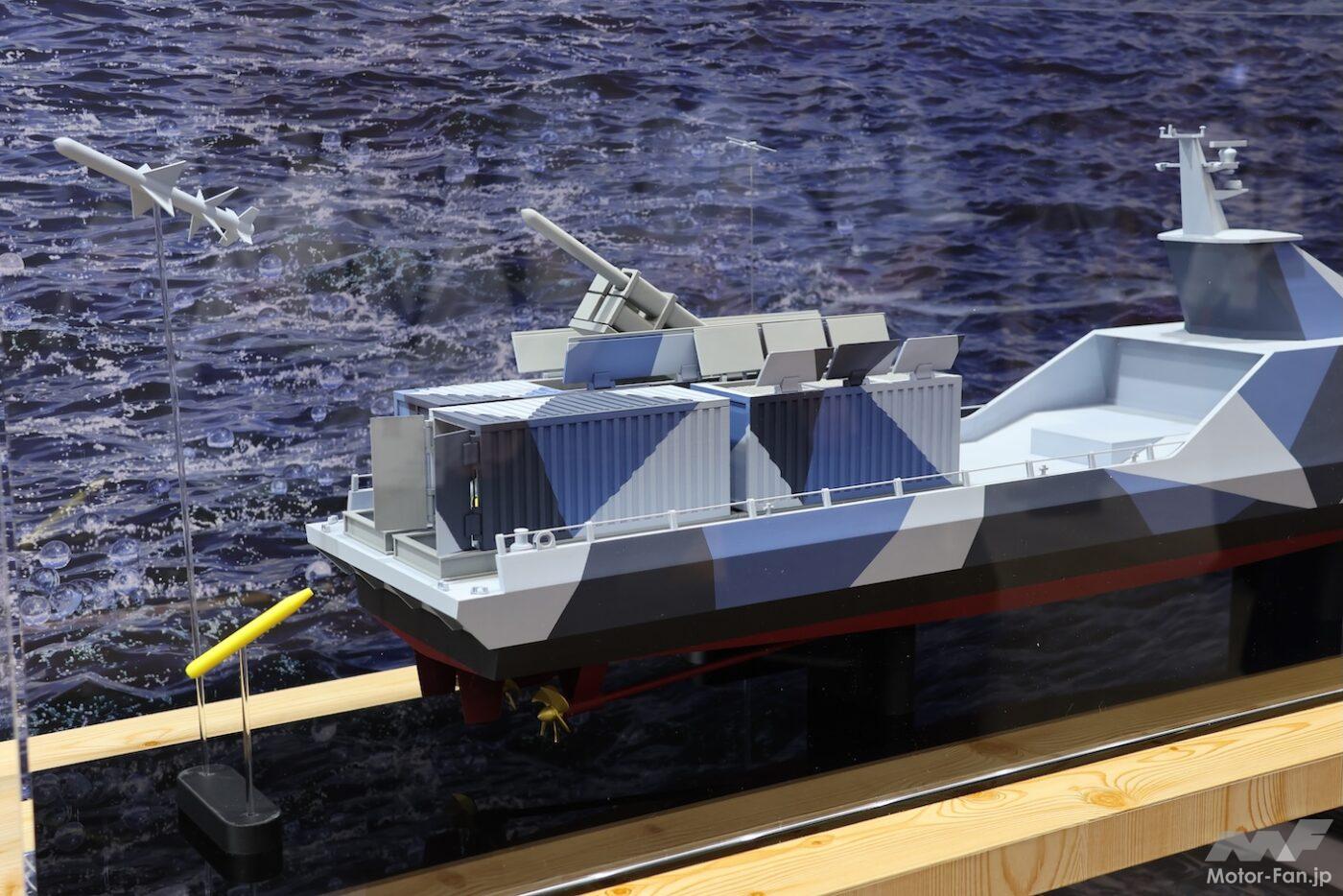 水上型は自律航行能力やミッション・モジュールの研究を、半潜航型は潜航能力の研究を行うという。ミッション・モジュールとは、異なる機能を持った交換可能な構成部品であり、今回公開された模型ではSSM(対艦・対地ミサイル)ランチャー、魚雷発射管、UAV発射装置などを搭載したコンテナを搭載していた。