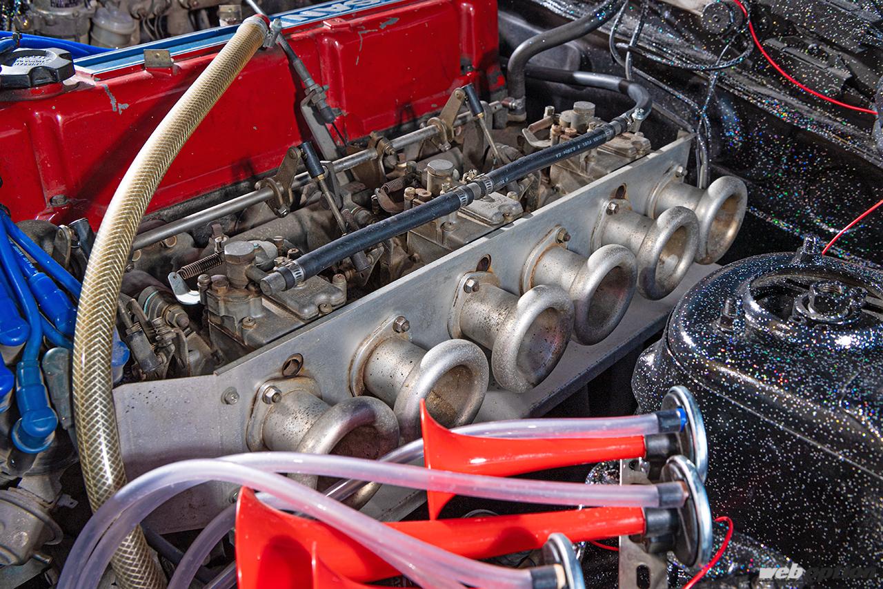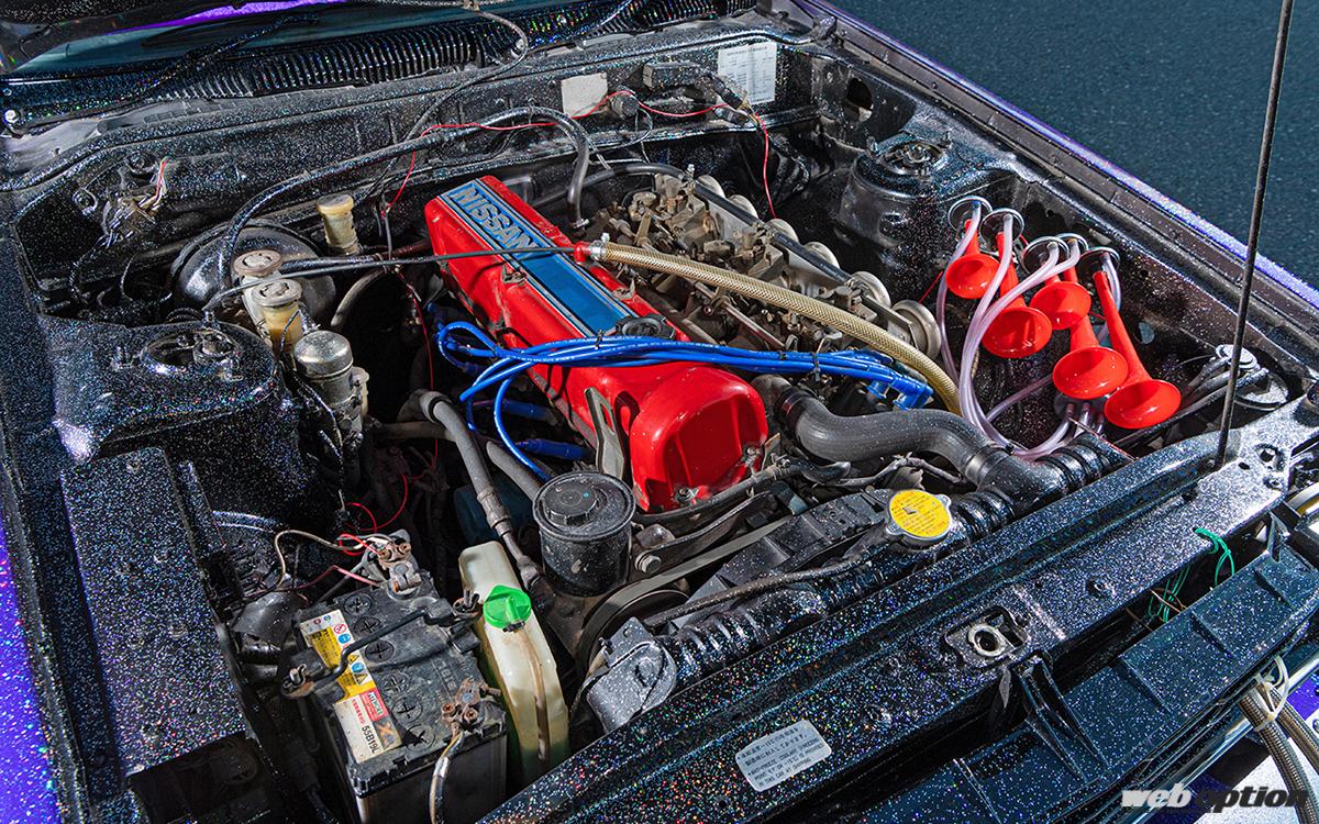 もちろんエンジンにも手が入り、L20はソレックスの44φソレックスキャブにタコ足、ワンオフデュアルマフラーという俗に言う“ソレ・タコ・デュアル仕様”とされている。街道レーサー仕様には欠かせないラッパもきちんと装備済みだ。「タイミングを見てエンジンルームも綺麗に仕上げたいですね」とは、あいばちゃん。
