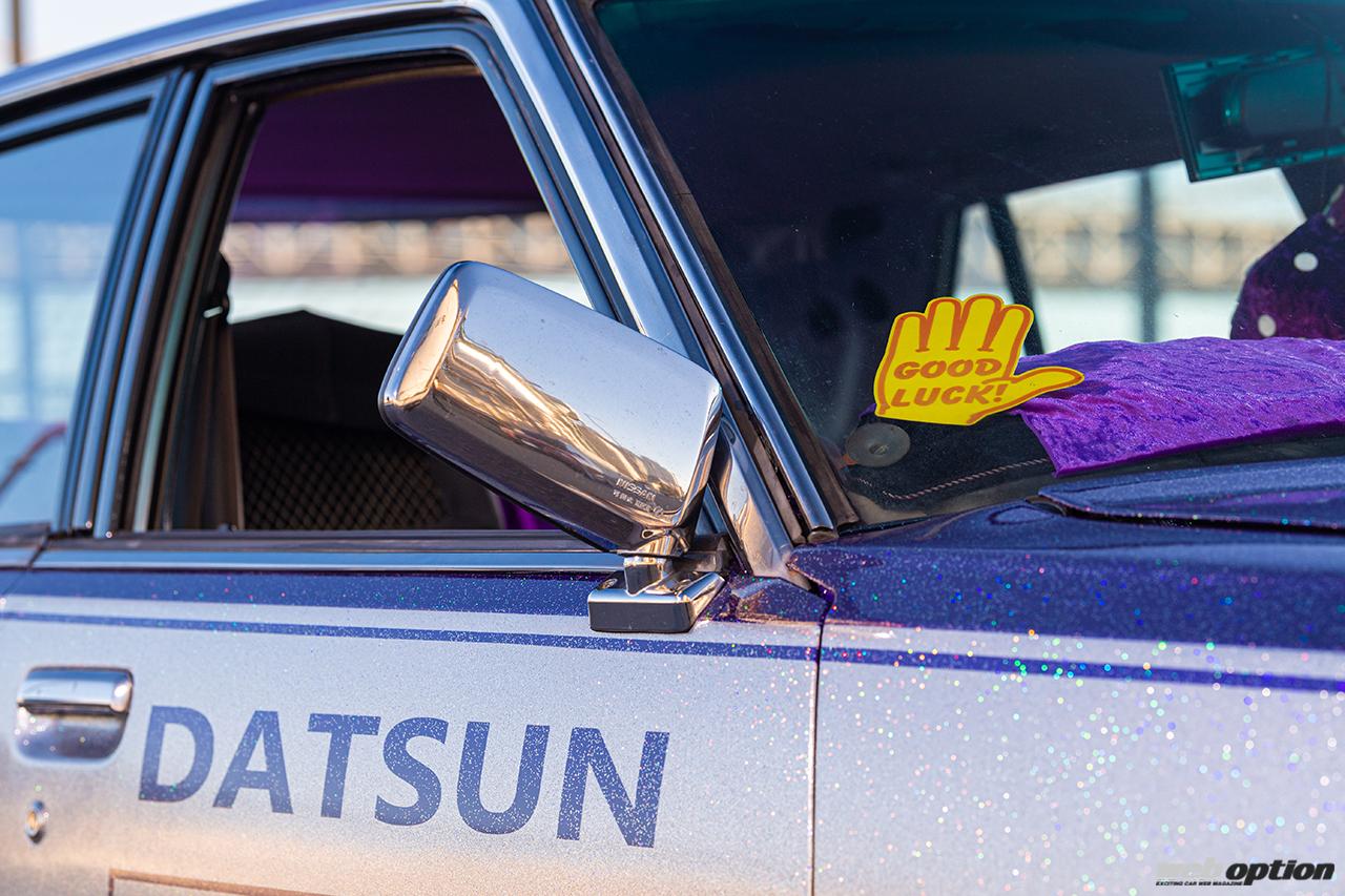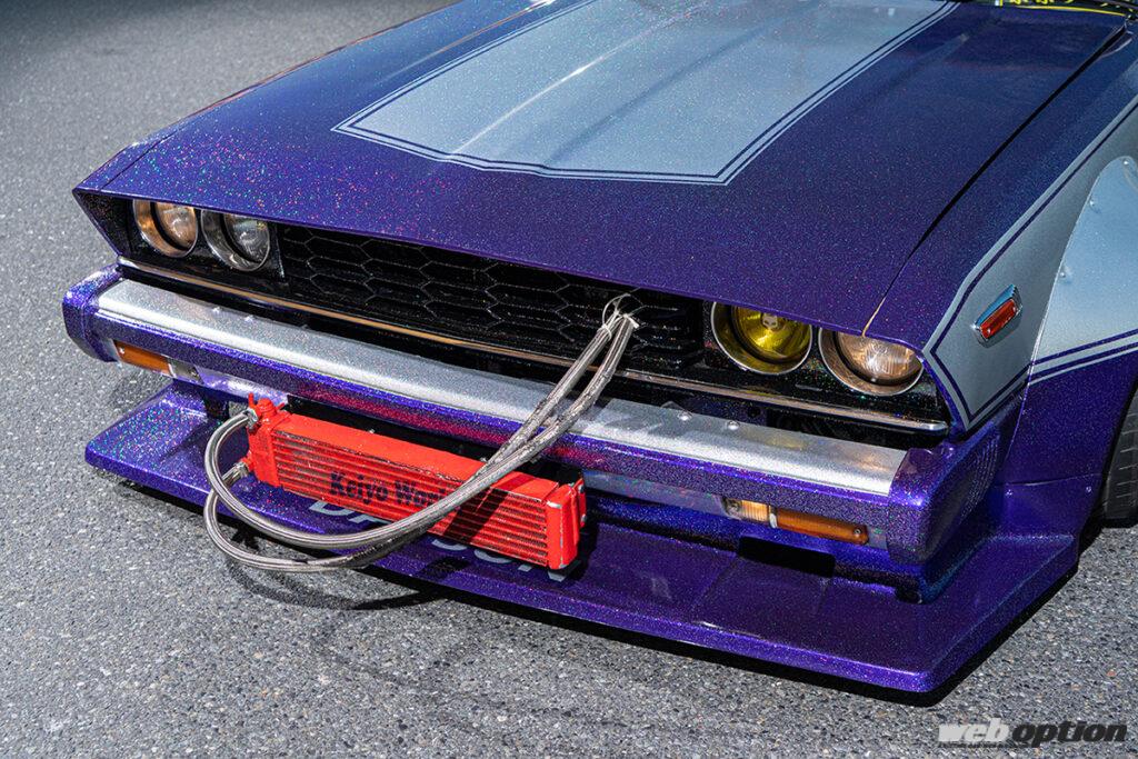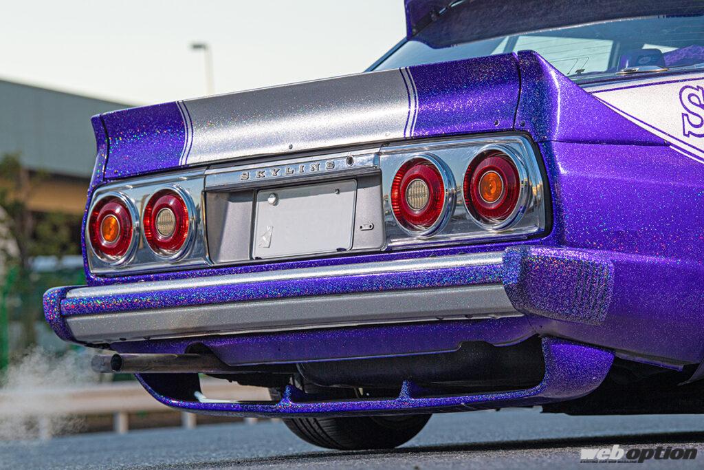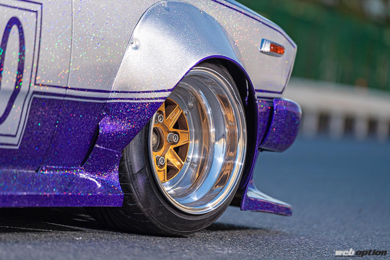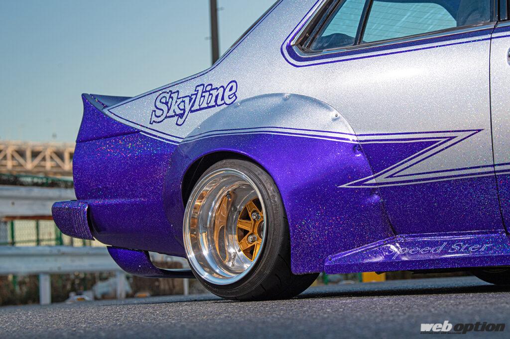 このジャパンに乗る“あいばちゃん”もまた、そんな往年の改造車文化に強い憧れを抱く一人だ。ベースは1981年式のGC210型スカイライン。ボディカラーは紫とシルバーの2トーンで、かなり粒子の大きなフレークを全体に吹きかけることによって煌びやかさを演出している。