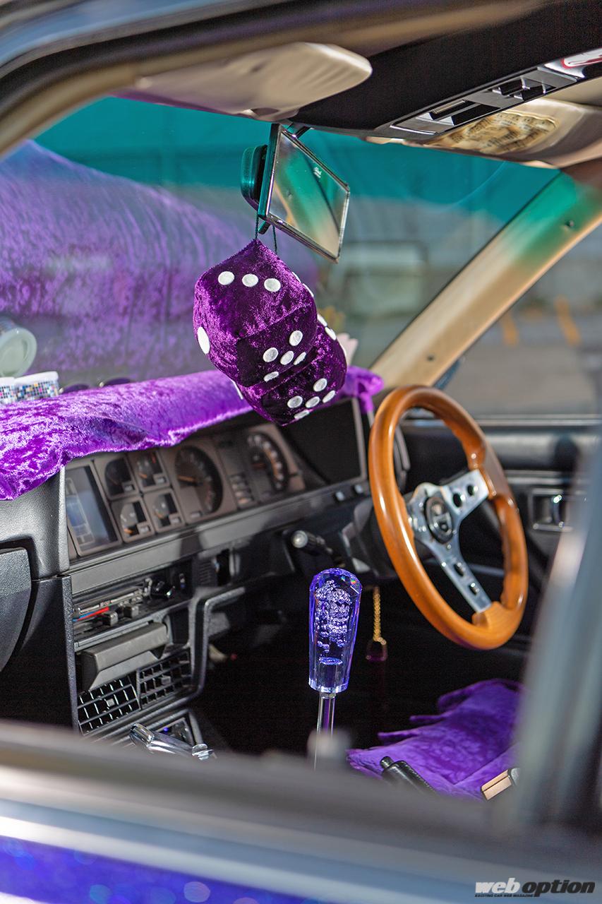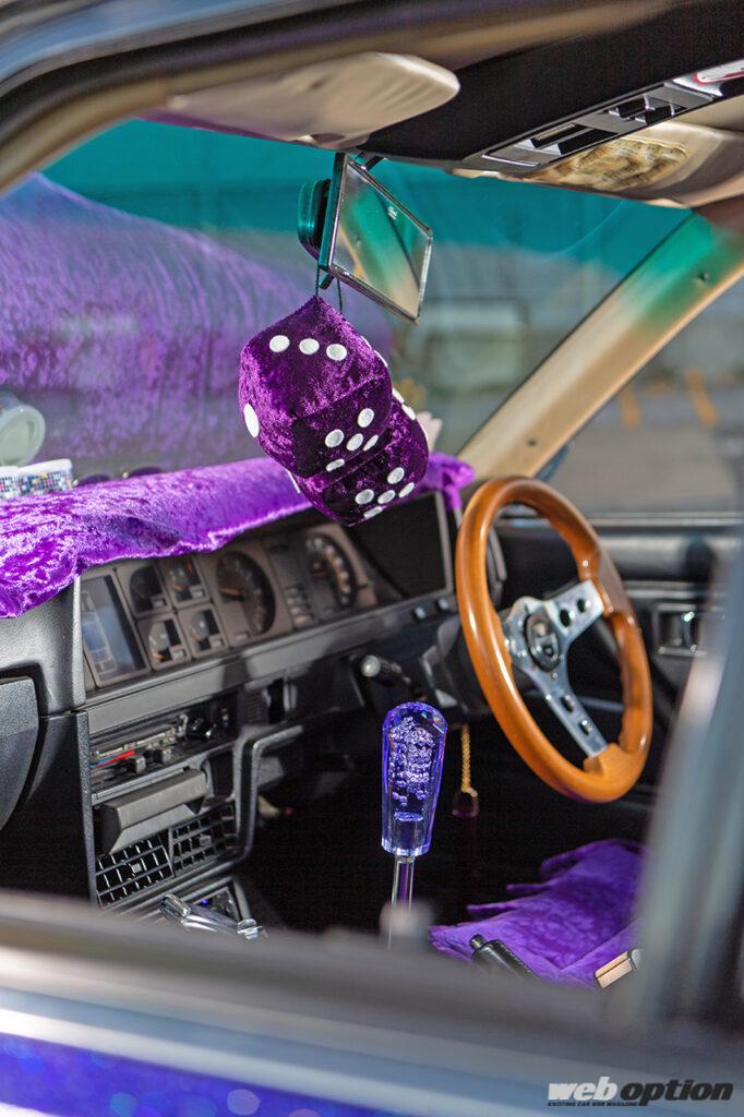 チンチラダッシュマットやサイコロなどの小物も紫で統一されたインテリア。シートは現状ノーマルだが、近いうちにダットサンタイプのバケットシートに交換予定とのこと。これもオーダーメイドで紫のステッチが入った拘り満点の仕様になるそうな。