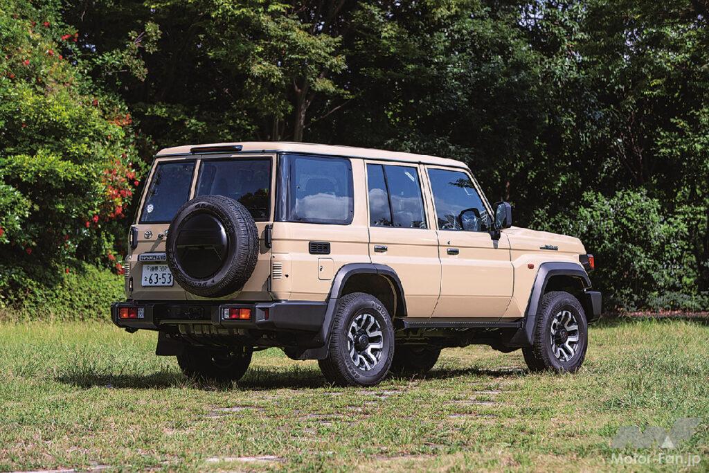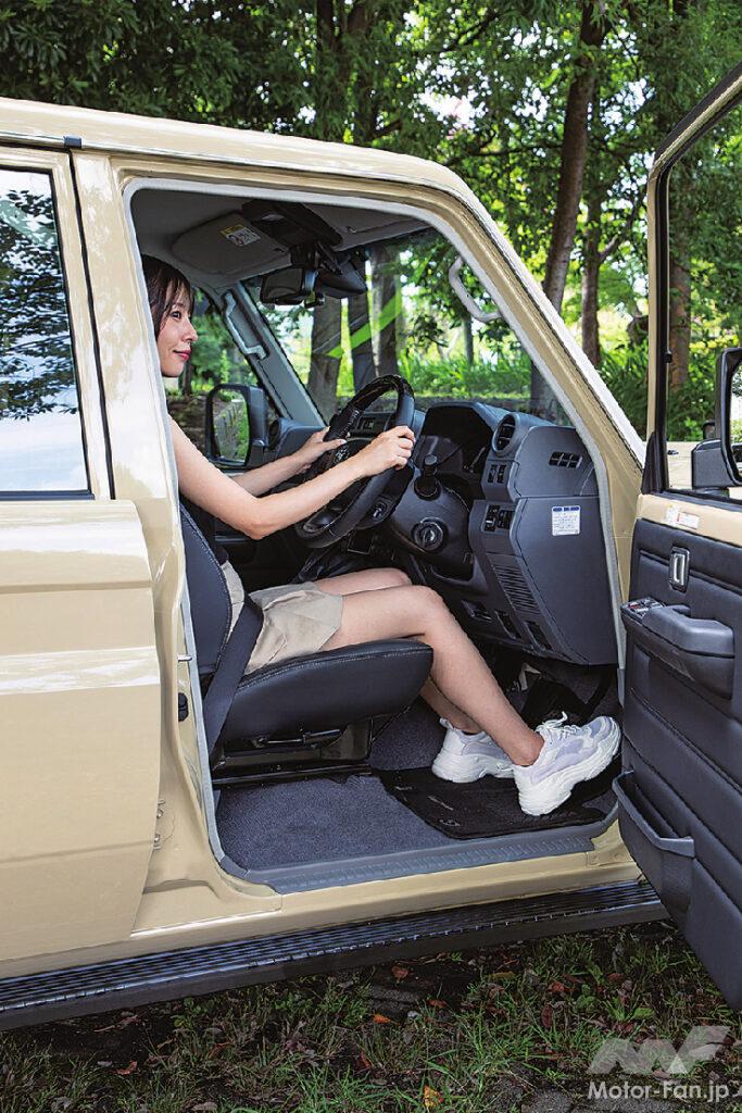 一方、ステアリングの操作感覚には40年前の面影を見い出せる。悪路での使い勝手と耐久性を考えて、操舵感は今でも鈍い。峠道のカーブや高速道路での車線変更では、操舵してから少しタイミングが遅れて進行方向が変わり、ボディの重さを意識させながら外側へ大きめに傾く。乗り心地もホイールとタイヤの重さを意識させて少し粗い。40年前に比べて洗練されてはいるが、悪路を優先させた設計を感じる。