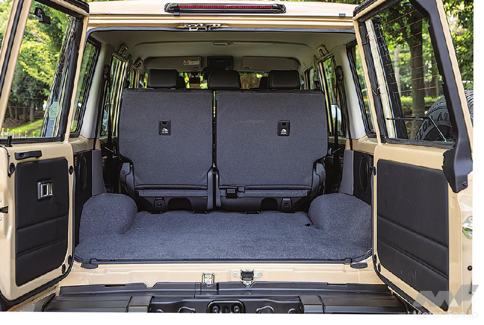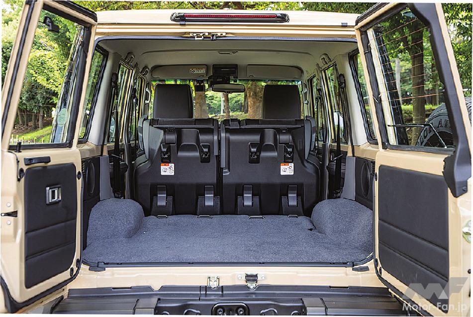 居住性にも古さが生じた。身長170㎝の大人4名が乗車して、後席に座る乗員の膝先空間は、握りコブシひとつ分弱に留まる。後席に座る乗員の足が前席の下に収まり、4名乗車は可能だが、昔のSUVの広さだ。その代わり荷室には余裕があり、リヤゲートはスペアタイヤを装着するために観音開きだから、狭い場所でも荷物を出し入れできる。不整地を走る作業車のクルマづくりだ。