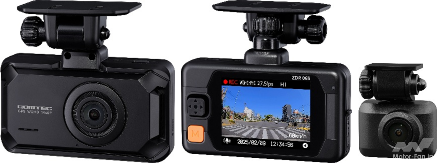コムテックの『ZDR065』は高画質な映像記録が特徴の2カメラドライブレコーダー。本体に内蔵されたフロントカメラは370万画素センサーを搭載し、WQHD画質(解像度2560×1440)での映像記録を実現している。一般的なドライブレコーダーで使われている200万画素センサーのフルHD画質(解像度1920×1080)に比べて約1.8倍も高精細な仕様だ。