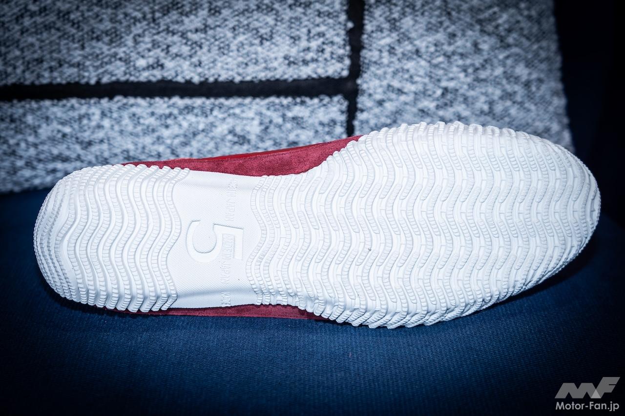 そして、「SP-MX5」は細かいところにも注目したい。織ネームと呼ばれるロゴを表示するラベルの部分にはジャガードと呼ばれる織物を採用することで、カジュアルなテイストをプラス。ただ上質なだけではなく、気軽に履くこともできる「隙」を取り入れたというわけだ。さらにソールの裏には、ロードスターの海外名である「MX-5」にちなんで「5」の数字が型抜かれている。