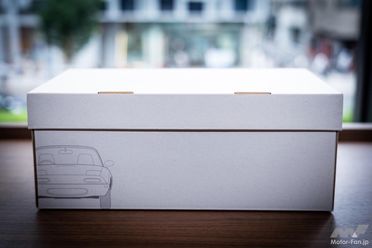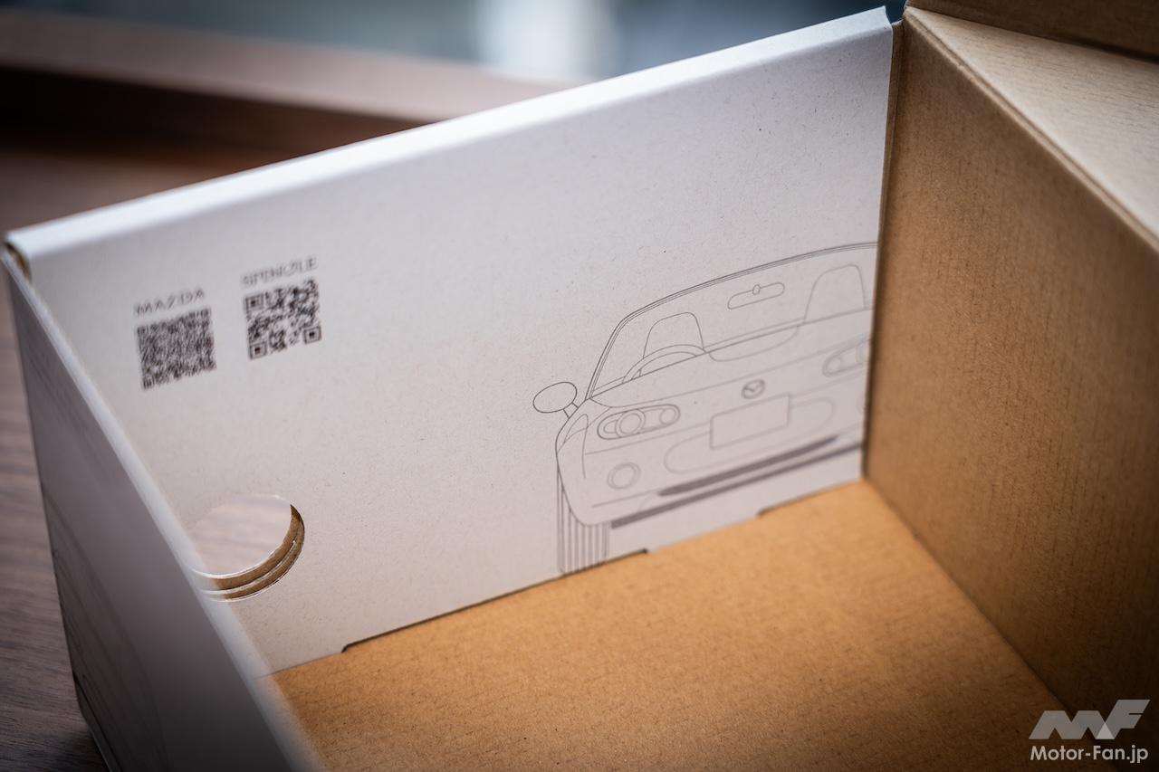 箱(パッケージ)もオリジナルで、ロードスターをモチーフにした線画があしらわれている。「NB型やNC型のオーナーの方からはよく『自分たちのモデルはないんだ』というこうしたグッズではないがしろにされがち(!?)なNB型やNC型もしっかりと散りばめられているので、オーナーの方はご安心を。