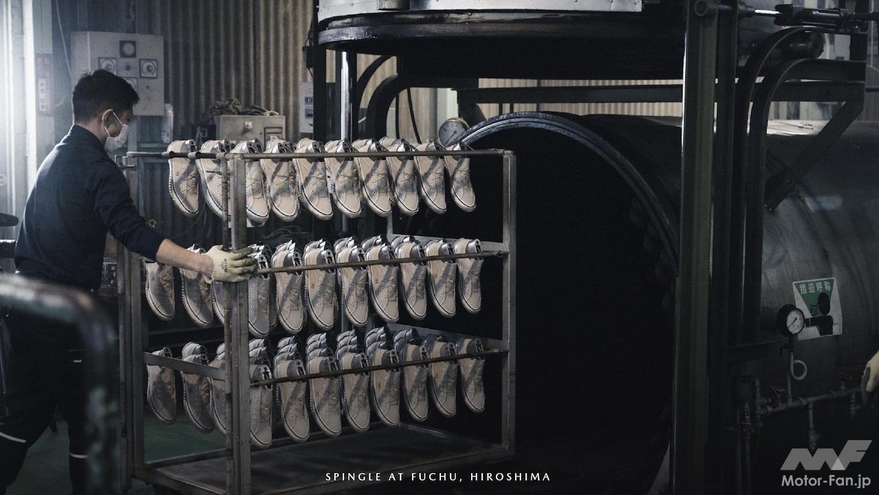 寺島さんをはじめとするマツダのスタッフがまず訪れたのは、92年続くスピングルカンパニーの歴史ある工場。そこではゴムと硫黄を混ぜたり、伸ばしてシート状に加工したりといった工程は機械の力を借りるものの、革の切断・縫製、型に合わせての張り込み、アッパーとソールの接着などの作業はいまだに職人による手作業で行われている。オートメーション化が進む自動車の工場とは対照的だ。