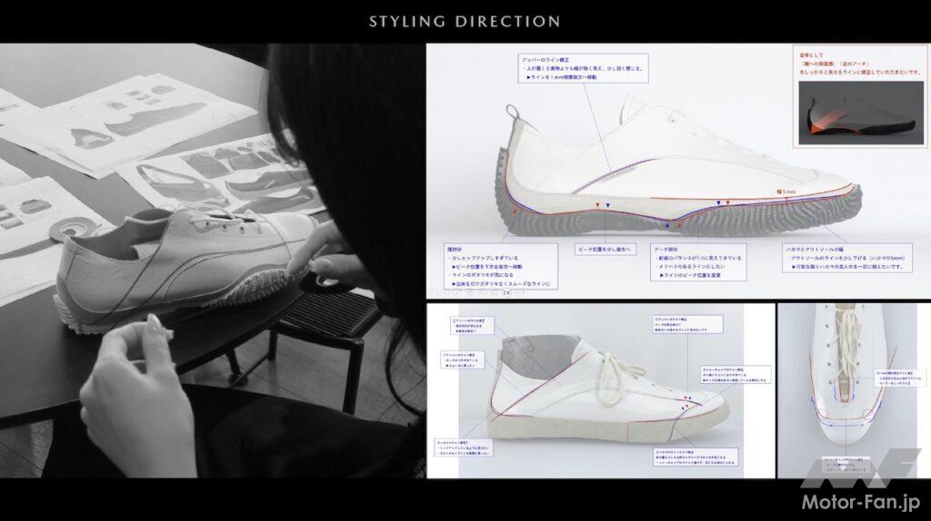 下の写真の左側は、クルマのエクステリアデザインで行なうのと同じようにテープドローイングを行いながら、デザインスケッチをいかに実際のシューズの立体感に落とし込めるかを検討しているところ。そして写真の右側は、デザインの修正指示図。まさにmm単位での細かい修正を事細かに行ない、サンプルをいくつもつくり直し、ときにはスピングルの工場まで足を運んで試作の担当者と顔を突き合わせて相談を重ねたりして、最終的にどこから見ても美しく見えるロードスターらしい曲線を実現することができた。