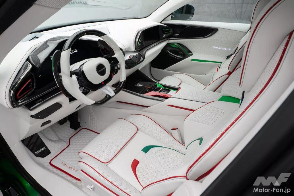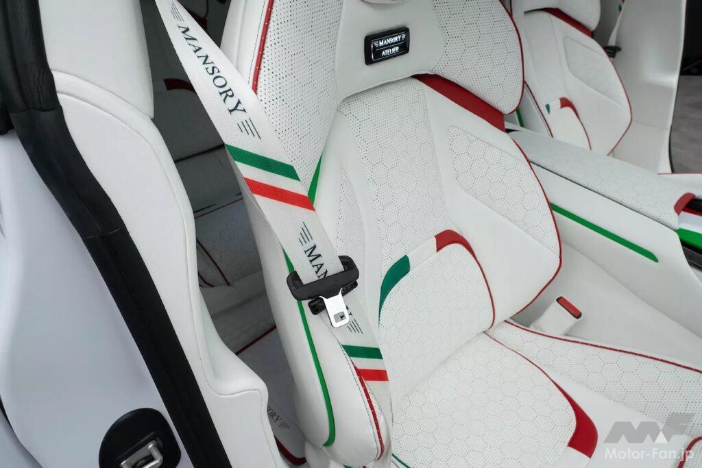 内部も手を抜かないのがマンソリーだ。豪華な白いレザーがシート、ステアリングホイール、ドアパネル、ダッシュボードを飾り、緑、白、赤のアクセントとのコントラストを際立たせている。これは座席、シートベルト、パドルシフター、ダッシュボードのパターンにまで及んでいる。