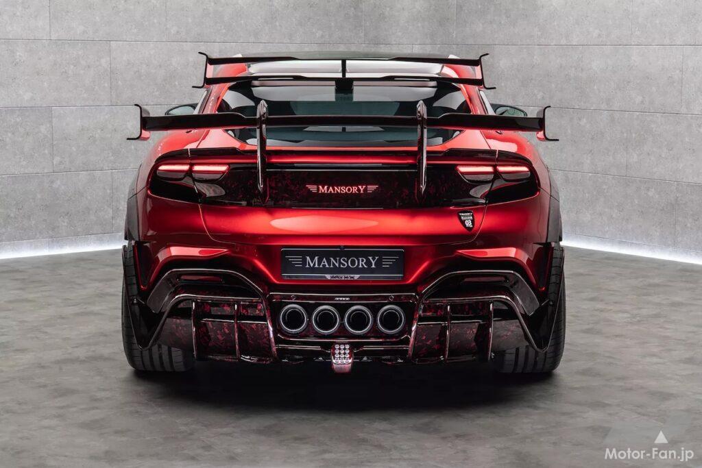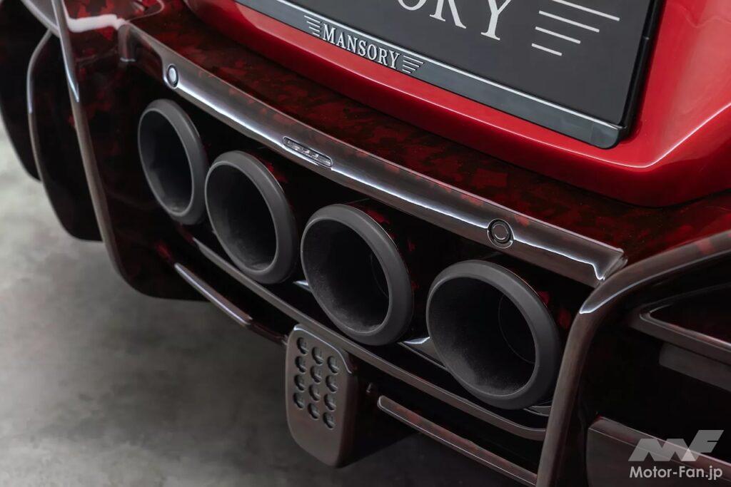 過激化されるのはフロントエンドだけではない。リヤセクションは赤く塗装され、リヤフェンダーやディフューザーにも赤いカーボンが使用されている。そして、このSUVにわずかに残されていた優雅さを消し去ってすべて台無しにしてしまう、2つの巨大なウィングが装着されている。白鳥の首のようなデザインのメイン・リヤウィングは、赤いカーボンで作られており、テールゲートに装着されている。また、標準仕様のプグネイターと同様に、リヤウィンドウの上にはセカンダリー・リヤウィングも装着されている。そして下部バンパーには4本出しの円形エキゾーストパイプがインストールされ、アグレッシブなディフューザーが装備されている。