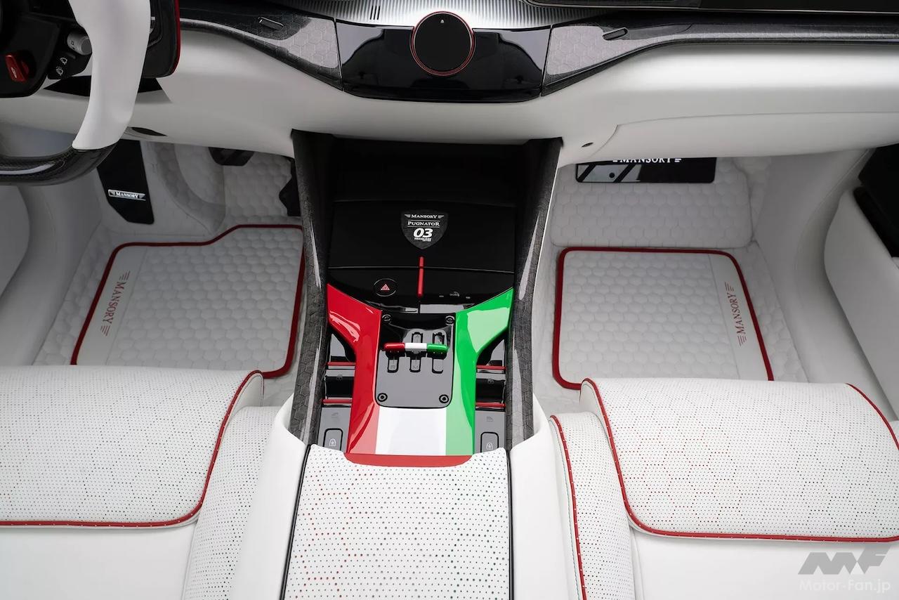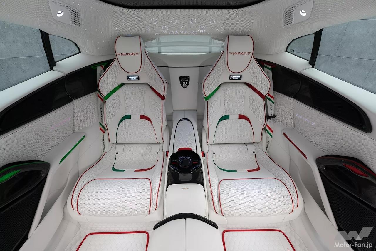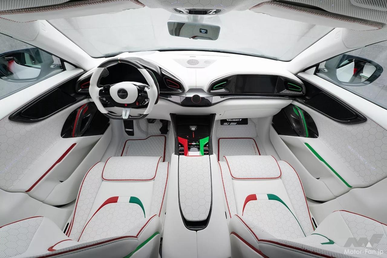 内部も手を抜かないのがマンソリーだ。豪華な白いレザーがシート、ステアリングホイール、ドアパネル、ダッシュボードを飾り、緑、白、赤のアクセントとのコントラストを際立たせている。これは座席、シートベルト、パドルシフター、ダッシュボードのパターンにまで及んでいる。