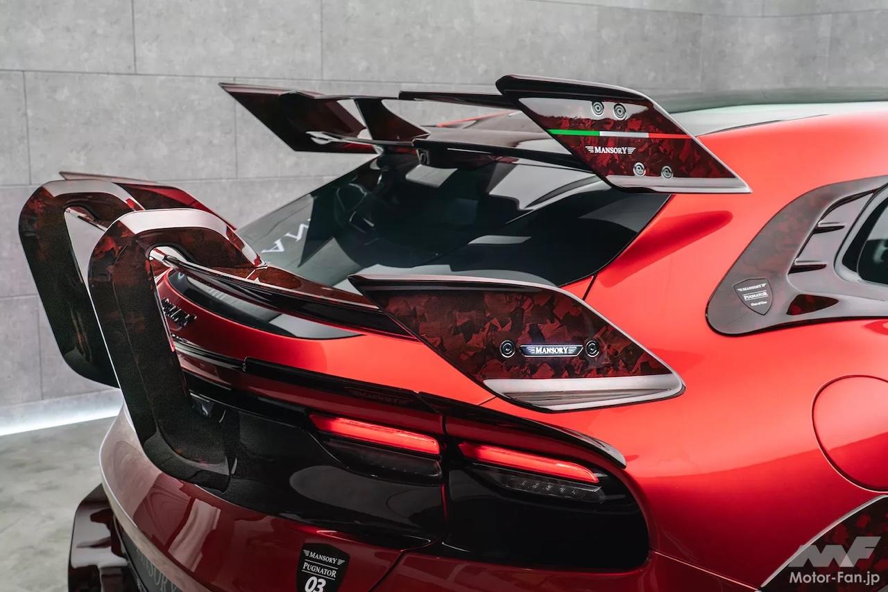 過激化されるのはフロントエンドだけではない。リヤセクションは赤く塗装され、リヤフェンダーやディフューザーにも赤いカーボンが使用されている。そして、このSUVにわずかに残されていた優雅さを消し去ってすべて台無しにしてしまう、2つの巨大なウィングが装着されている。白鳥の首のようなデザインのメイン・リヤウィングは、赤いカーボンで作られており、テールゲートに装着されている。また、標準仕様のプグネイターと同様に、リヤウィンドウの上にはセカンダリー・リヤウィングも装着されている。そして下部バンパーには4本出しの円形エキゾーストパイプがインストールされ、アグレッシブなディフューザーが装備されている。