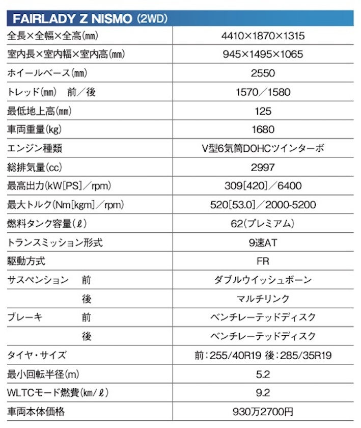 日産直系のモータースポーツ担当子会社NISMOが手掛けたこのモデルは、ベース仕様の405PS/475Nmというツインターボ付きの3ℓ V型6気筒エンジンが発する最高出力/最大トルクを、420PS/520Nmにまで向上させている。さらに、専用デザインのボディキットや専用チューニングが施されたサスペンション、鍛造ホイールを採用するほか、インテリアにも専用のレカロ製スポーツシートを用意。一見して、いかにもNISMOの作品らしいラインナップの中でも最もスパイスの効いた一台として用意された〝特別なZ〞に相応しい内容を秘めた存在であることを主張している。