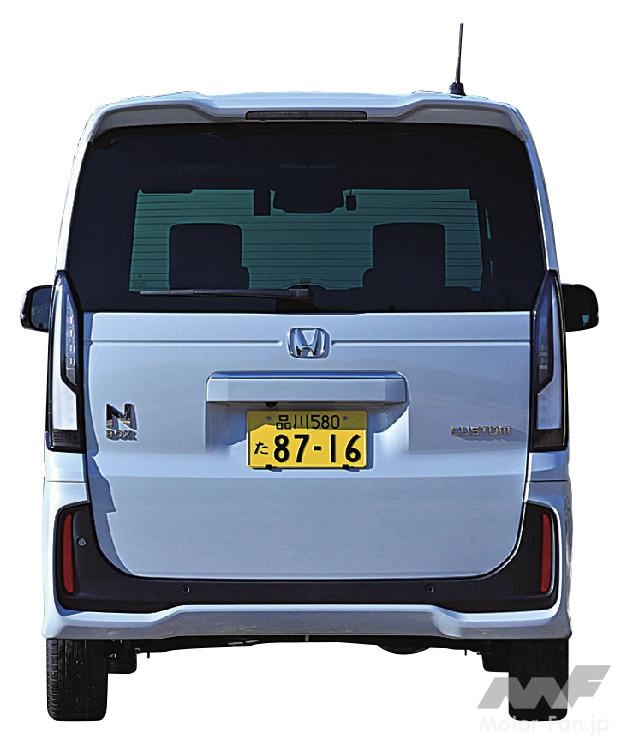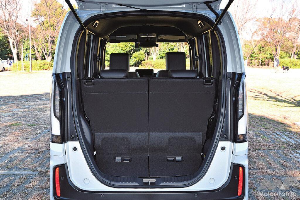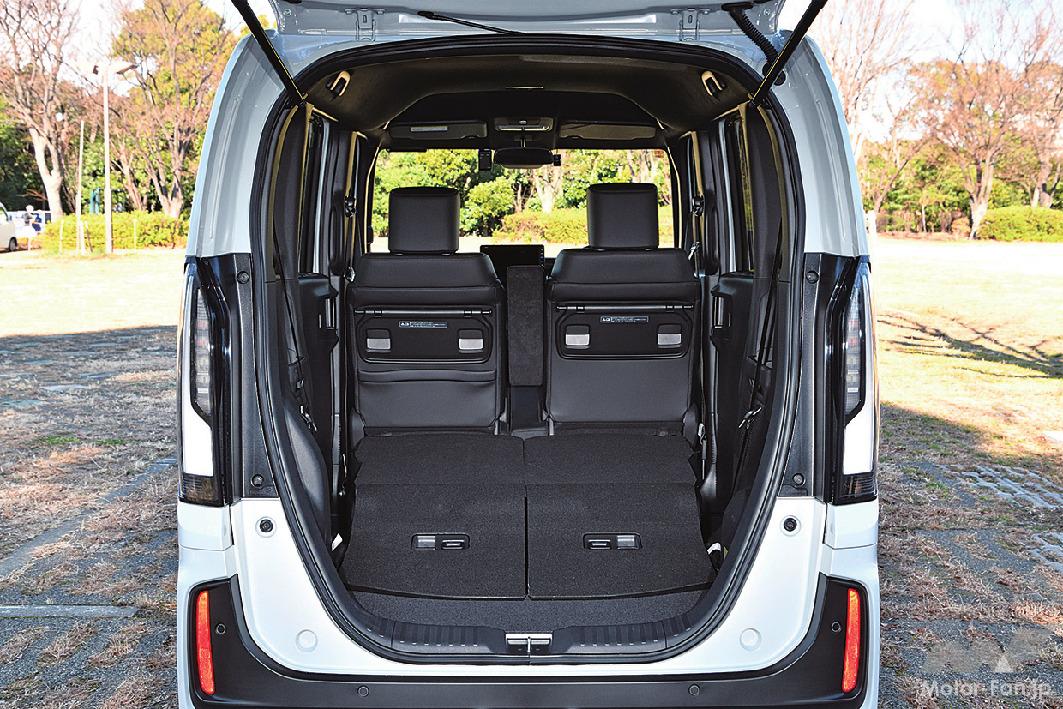 エンジンは補機類の配置を含めて縦長に設計され、有効室内長を十分に確保。その結果、身長170㎝の大人4名が乗車した際、後席を後端までスライドさせると足元空間は握りコブシ4つ分に達する。後席を少し前側へ寄せても足元に十分な広さがあり、この状態で後席の後ろ側に相応の荷室を確保できる。後席の背もたれを前側に倒すと座面も下がり、大容量の荷室に変更できる。特にN-BOXは燃料タンクを前席の下に配置するため、ほかの車種よりも荷室の床が低い。路面からリヤゲート開口下端部までの高さは470㎜に収まり、自転車を積むときも前輪を高く持ち上げる必要はない。先代型に比べて収納設備は減ったが、積載性は優れている。