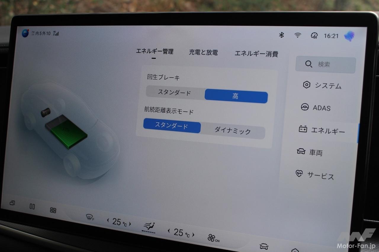 電動車らしからぬ加速、減速の制御の良さは、回生時も同じで、「高」と「スタンダード」から選択できる回生ブレーキを「高」にしても乗員の酔いを誘うような急制動にはならない。ワンペダル的なフィーリングではない。せっかくのEVなので、もう少し強い回生ブレーキが得られると山道や高速道路などでは減速しやすく、走らせやすいように感じられたが、逆に純ガソリン車(ICE)などからの乗り替えでも違和感を抱くシーンは少ないだろう。