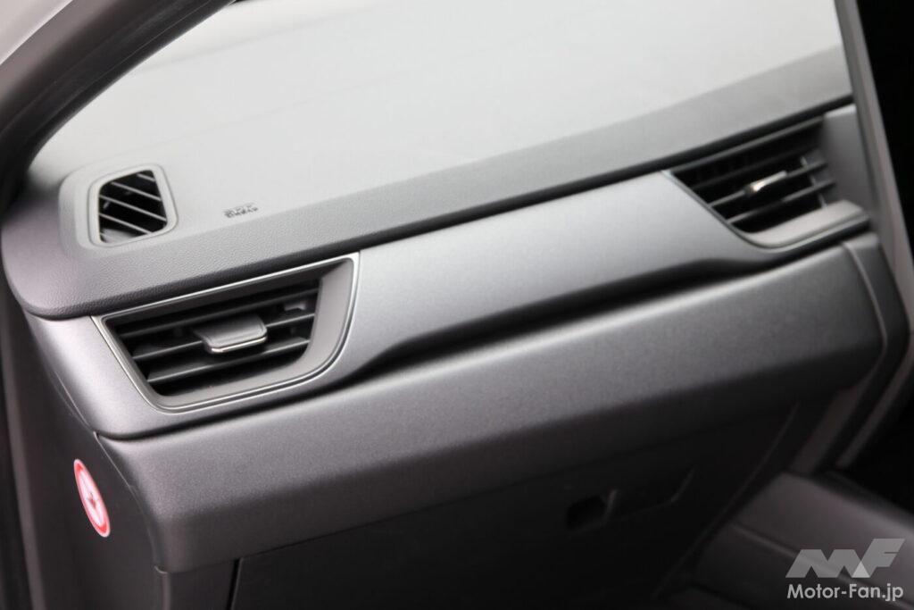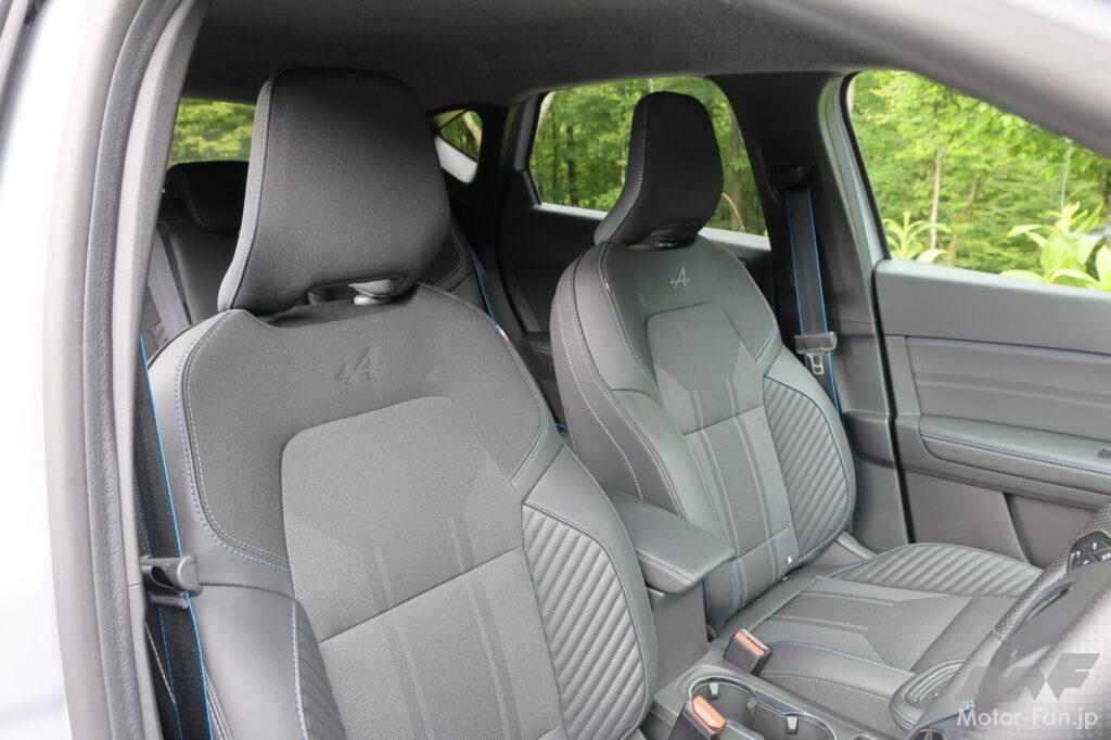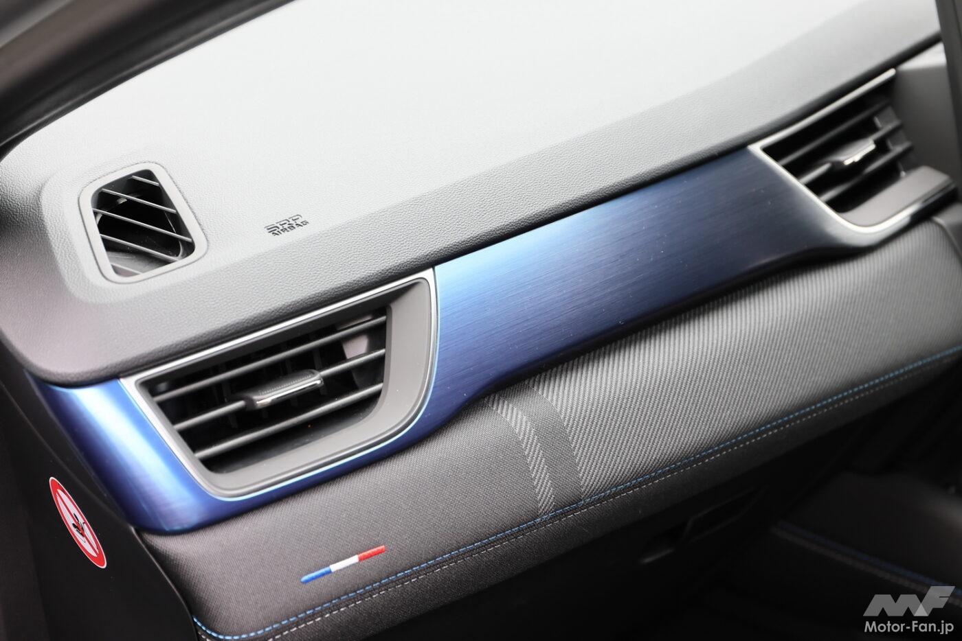 インテリアでの注目は、インパネ中央に置かれた10.4インチの縦型ディスプレイ。こちらは各種設定を行なうほか、スマートフォンと連携するインフォテイメントシステムとして機能する。さらにエスプリ アルピーヌは、助手席前にあるグラデーションの効いた加飾パネルや、ロゴ入りバイオスキンシートを採用。シートベルトにブルーステッチが入っているのも洒落ている。