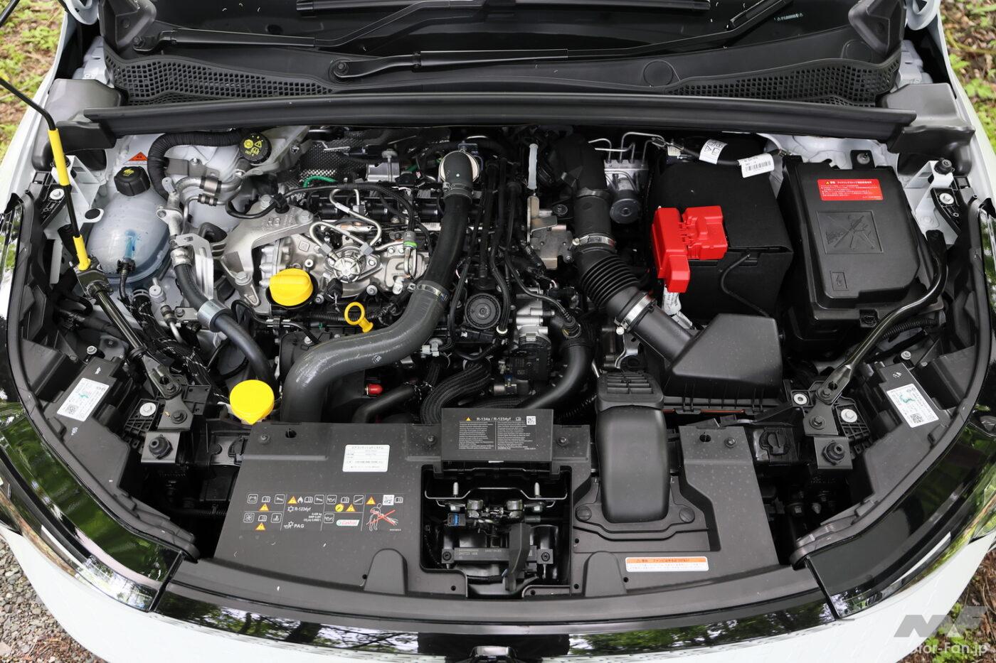1.6Lエンジンと2つのモーター、1.2kWhの水冷バッテリーを組み合わせたフルハイブリッド「E-TECH」も、バッテリー充電量を40%以上にキープして、電動パワートレインのアドバンテージを最適化する「E-SAVE」機能を備えるなど進化。WLTCモード燃費も23.3km/Lとマイナーチェンジ前の22.8km/Lから向上している。