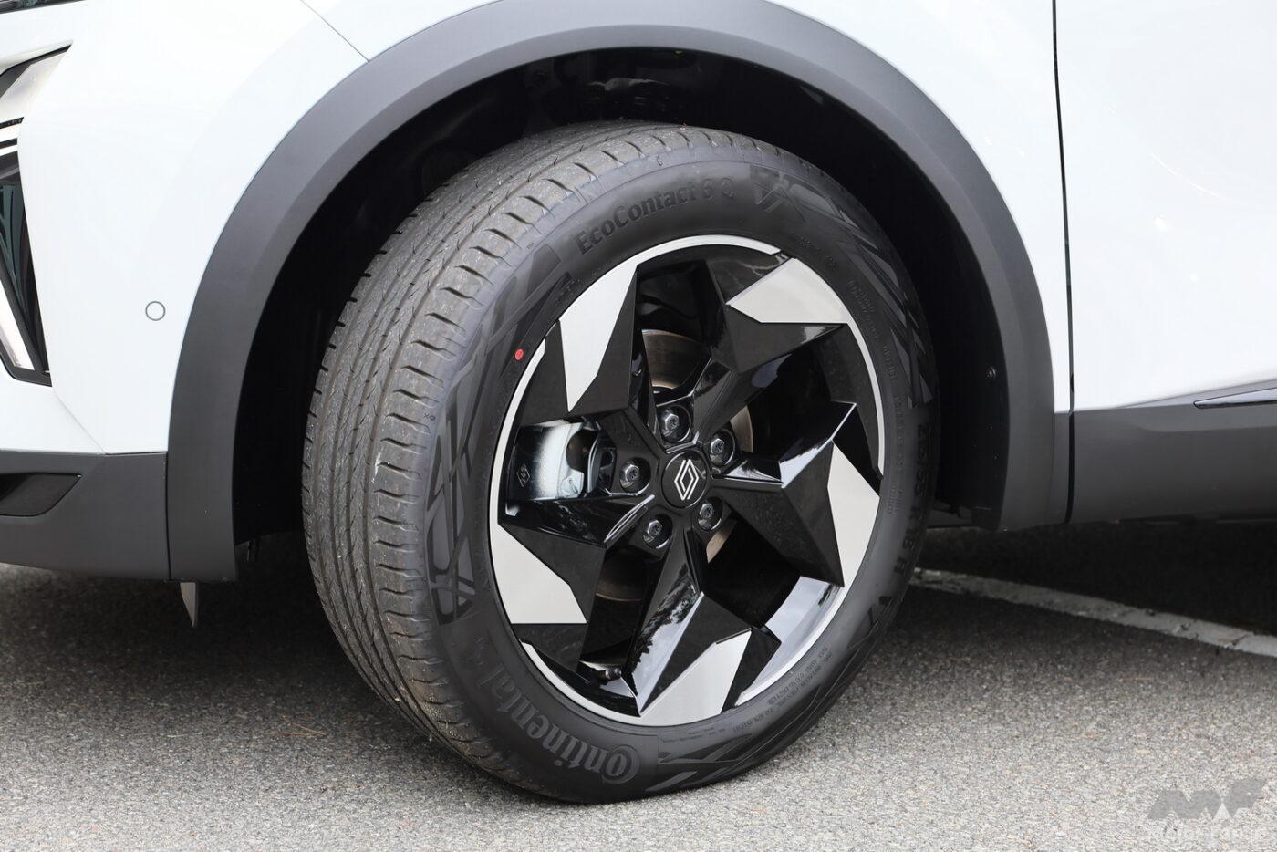 エスプリ アルピーヌについてはタイヤ銘柄、アルミホイールの意匠とも共通仕様だが、ホイールの隙間から覗けるフロントブレーキはフルハイブリッドとマイルドハイブリッドで異なる仕様となっていた。キャリパーの形状も違えば、ブレーキローターも別物。マイルドハイブリッドのローターはハット部分にホールが開けられた設計となっている。その狙いをひと言で表現するのは難しいが、エンジニアが細部までこだわっていることは間違いない。