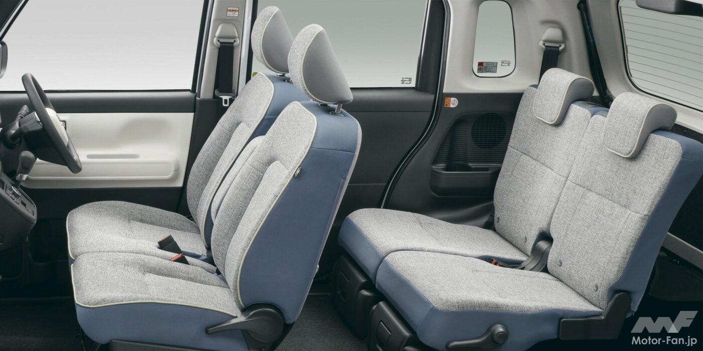 特に、全長と全幅は変わらないものの、ホイールベースが旧型よりわずか5mm延長されただけにもかかわらず、室内長+60mm、室内幅+15mmと、室内空間の拡張に一役買っている。これにより、後席の足元スペースや横方向の余裕が増し、大人4人でフル乗車した際でも圧迫感は旧型より少なくなっている。もっとも実質的な姉妹車と言えるムーヴキャンバスと比べると、室内長-40mm、室内幅-10mm、室内高-5mmとなっており、ミニバン的キャラクターのムーヴキャンバスとの差別化が見られる点だろう。