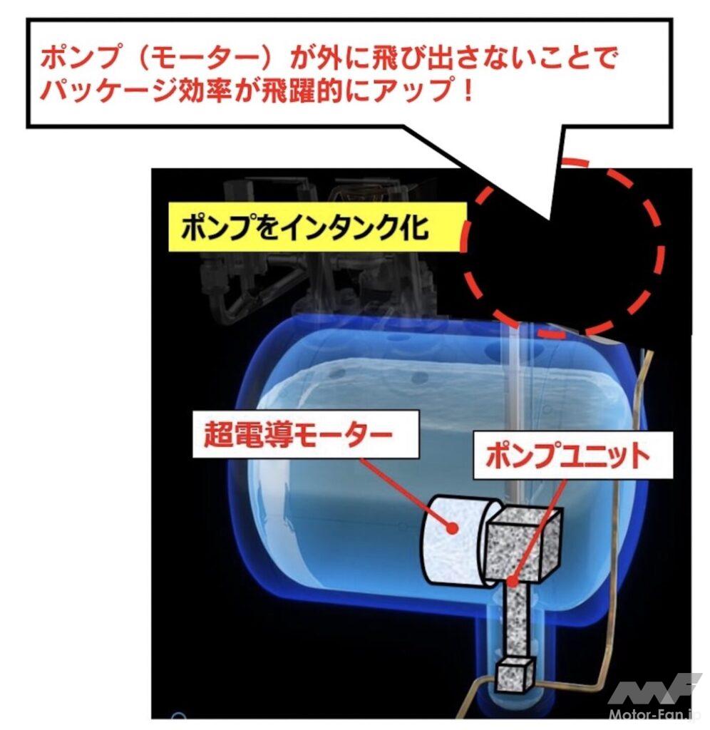 今後の課題も見ている。液体水素技術を市販車に活用できるレベルに引き上げるには、さらなるパッケージ効率アップが必須だ。課題となっているのは、ポンプ。これを小型軽量化、さらにインタンク化するための技術として「超電導」に取り組んでいる。液体水素を使うことでタンクの中にはー253℃の極低温がある。これを利用することでタンク容量(と水素搭載量)を3割アップさせるのが目標だ。当然走行可能距離も3割伸ばせる。現在約135kmを180km程度にできる計算だ。超伝導ポンプの感性の時期は見えていないが、開発は確実に進んでいるという。こちらの進展も楽しみだ。