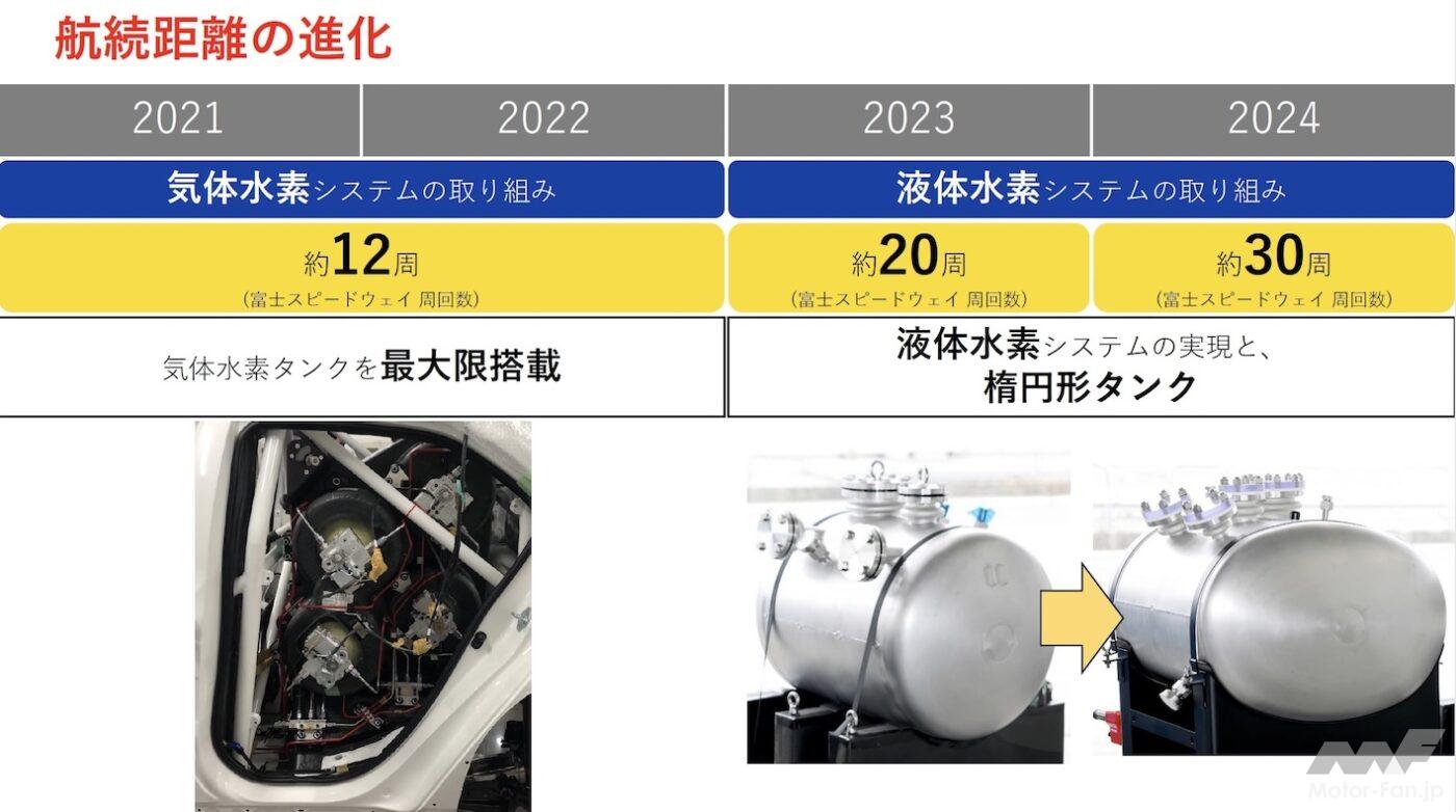 開発初年度の2021年、22年はFCEVのMIRAIの高圧(70MPa)気体水素タンクを4本搭載し、圧力調整弁を介して水素をエンジンの送るシンプルな構成だった。初挑戦の21年でも無事に完走し、その可能性を証明して見せたが、水素燃料供給のインフラスペースは巨大でレースの現場には似つかわしくないものだった。そこで、24年は、気体水素から液体水素燃料を搭載するシステムに進化。真空二重層の液体水素タンクに充填されたー253℃の液体水素を気化器へ送る昇圧ポンプが技術的ハードルとなった。