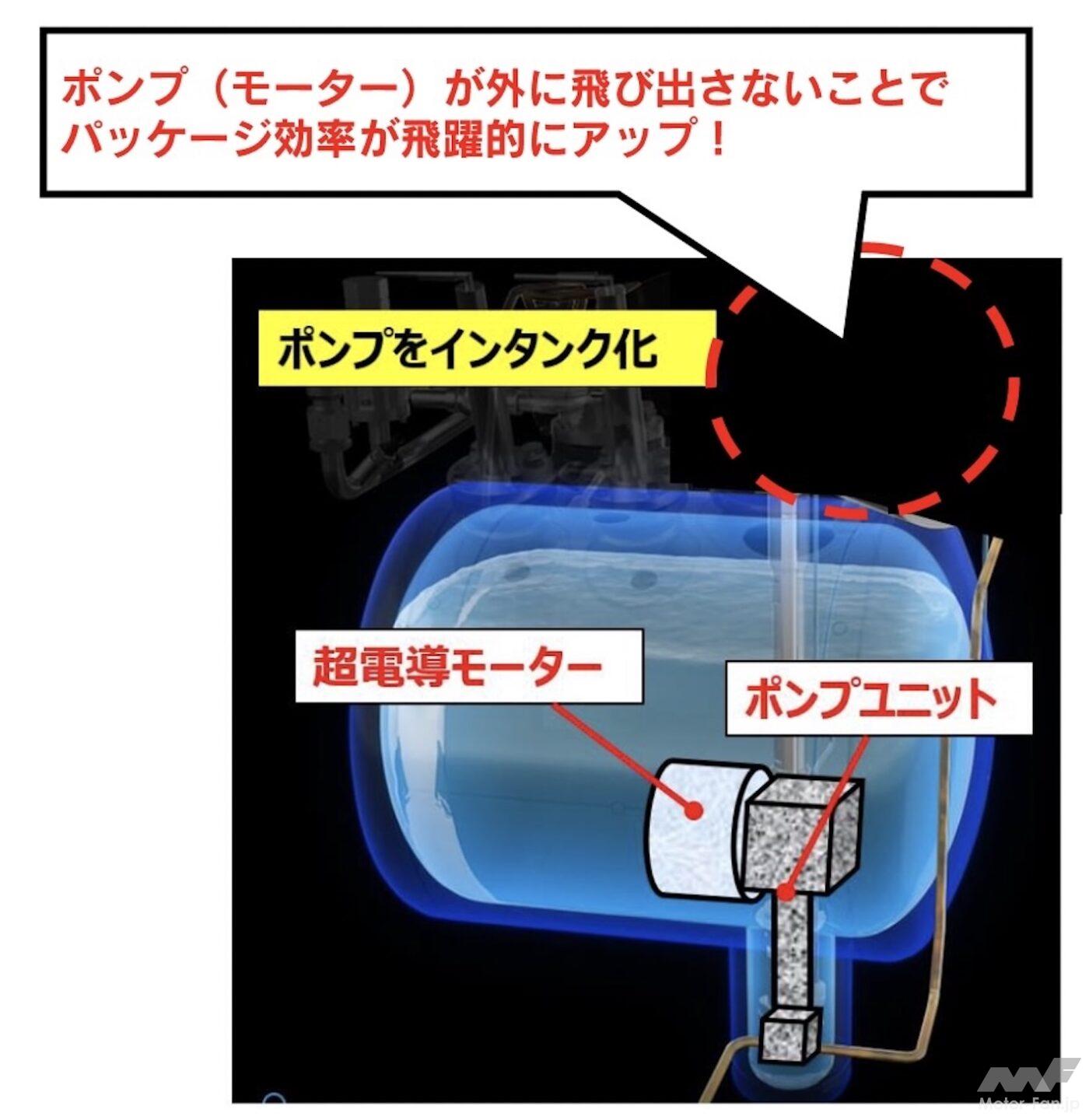 今後の課題も見ている。液体水素技術を市販車に活用できるレベルに引き上げるには、さらなるパッケージ効率アップが必須だ。課題となっているのは、ポンプ。これを小型軽量化、さらにインタンク化するための技術として「超電導」に取り組んでいる。液体水素を使うことでタンクの中にはー253℃の極低温がある。これを利用することでタンク容量(と水素搭載量)を3割アップさせるのが目標だ。当然走行可能距離も3割伸ばせる。現在約135kmを180km程度にできる計算だ。超伝導ポンプの感性の時期は見えていないが、開発は確実に進んでいるという。こちらの進展も楽しみだ。