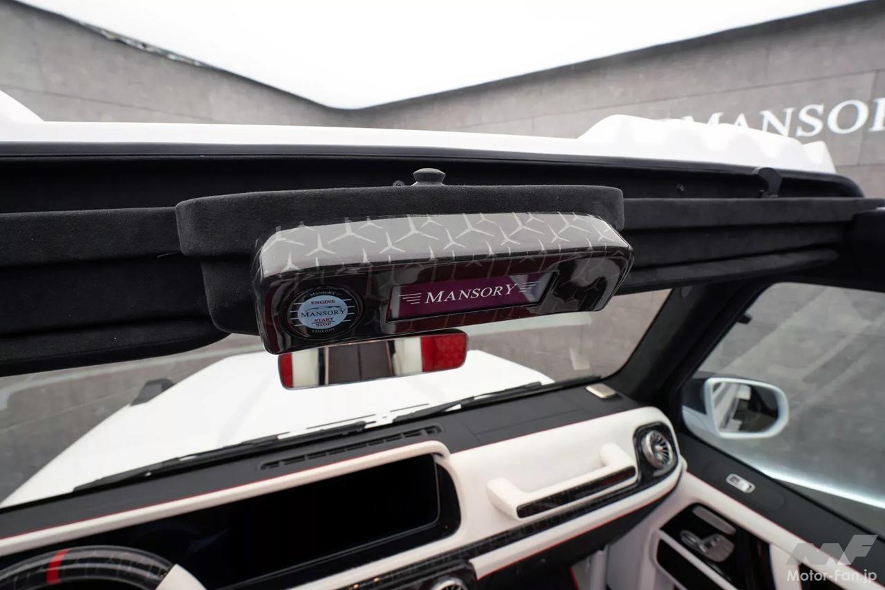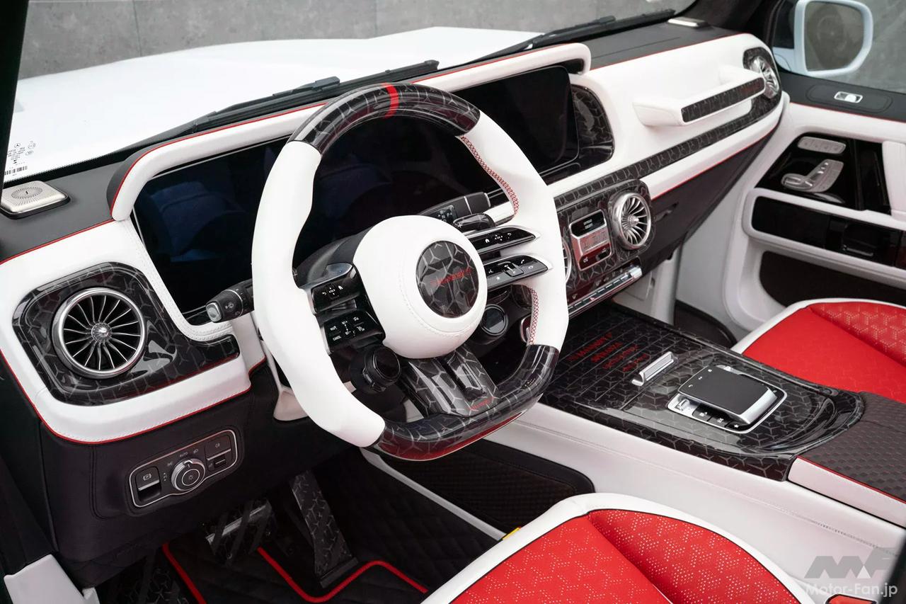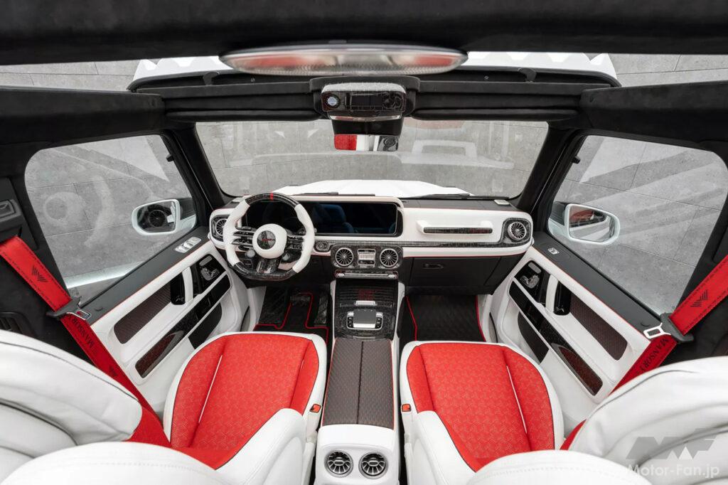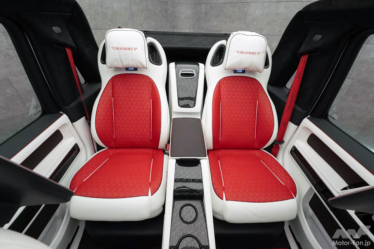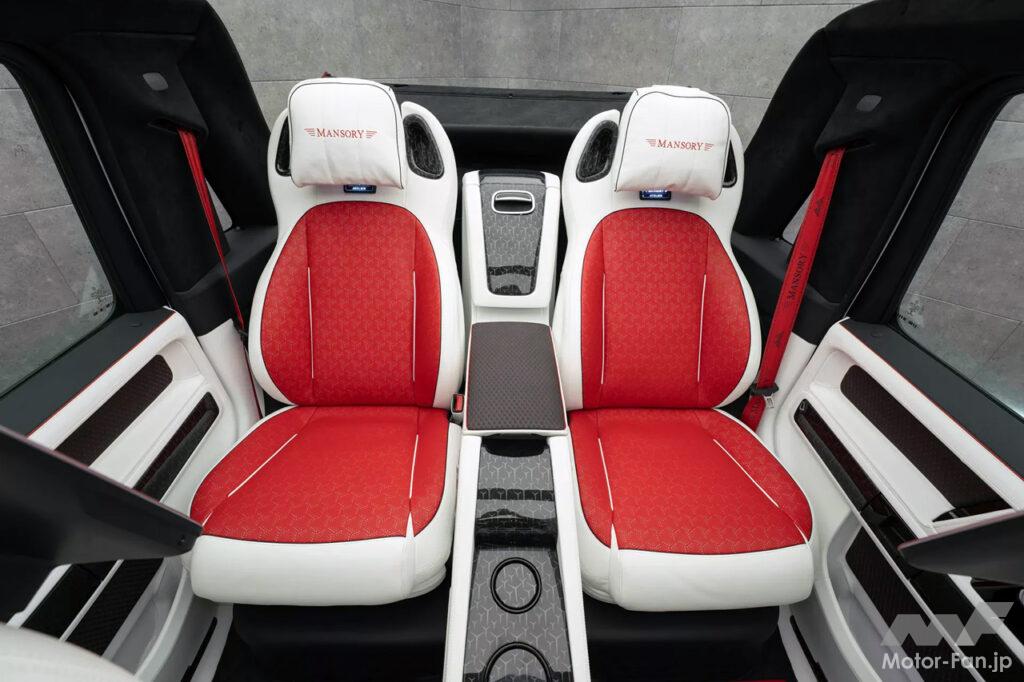 インテリアは、ステアリングホイール、ダッシュボード、ペダル、センターコンソール、ドアパネルにカーボンファイバーのアクセントがあしらわれるなど、マンソリーならではといえるこだわりが随所に施されている。シートと内装は白と赤のレザーで覆われ、従来のSUVというよりはラウンジのような豪華でクールな雰囲気となっている。