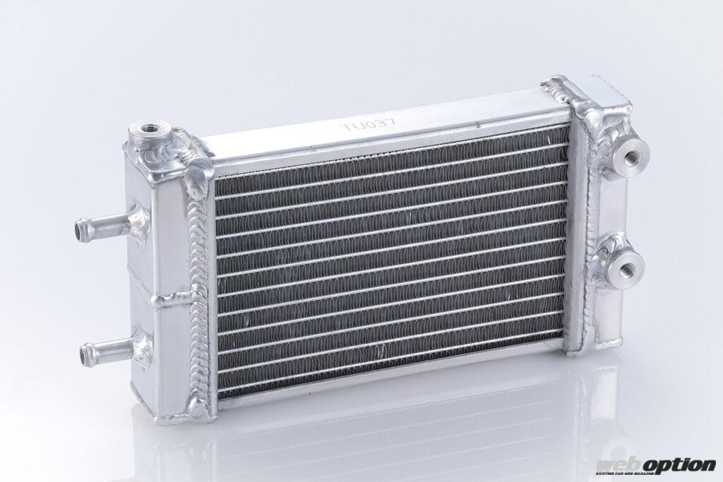 GR86/BRZに標準採用されている水冷式オイルクーラーは、クーラントをオイルブロック内のウォーターラインに循環させることで油温の上昇を抑えるシステムだ。そしてこの製品は、そのクーラントを冷却するための装置。オイルブロック手前に専用の小型コアを設置し、純正水冷式オイルクーラーの熱交換効率アップを狙うのである。